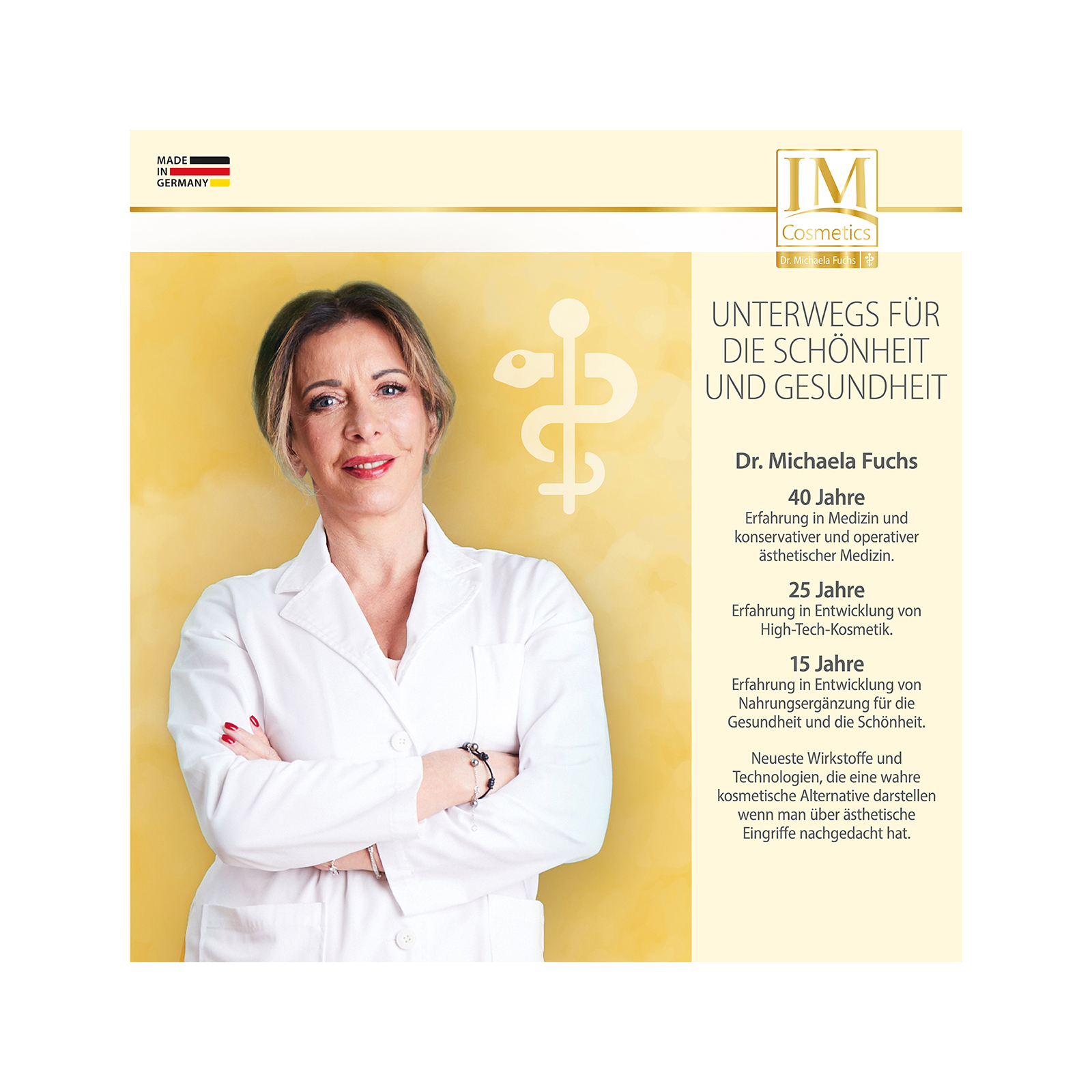 Das Liquid Lift Intensiv-Gesichtsserum von IM Cosmetics steht für eine neue Ära der Hautverjüngung. Inspiriert von modernster Medizin und Zellbiologie, vereint das Serum drei hochwirksame Anti-Aging-Komponenten in einer einzigartigen Formulierung. Hinter Liquid Lift, steht Dr. Michaela Fuchs, eine Expertin mit über 25 Jahren Erfahrung in der Entwicklung von High-Tech-Kosmetik.