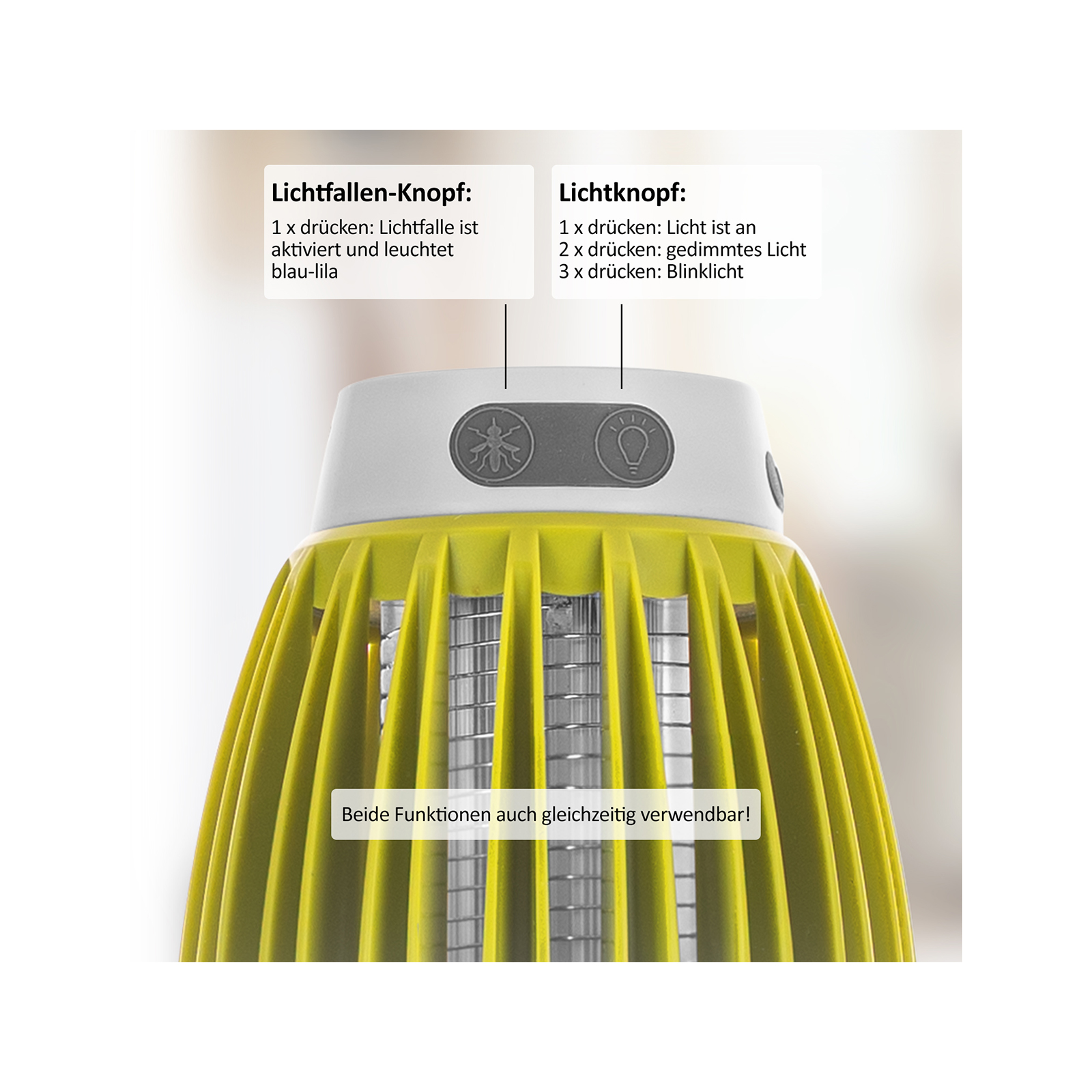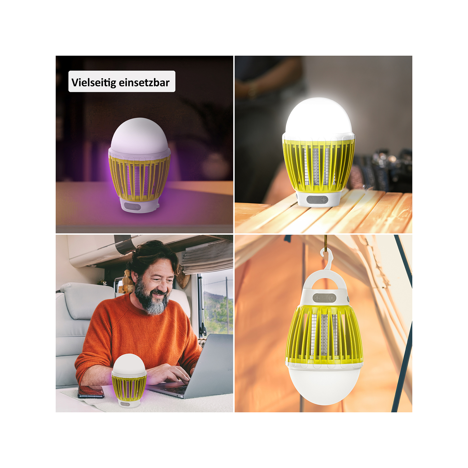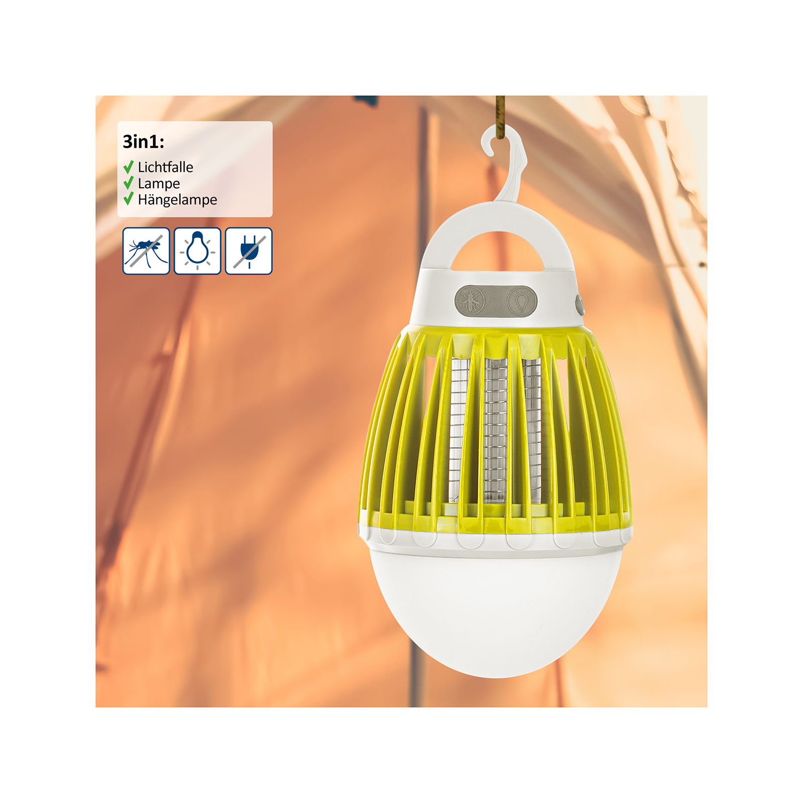 Neben der Funktion als Insektenschutz bietet Ihnen die 3in1 Lichtfalle auch die Eigenschaft, Licht spenden zu können. Verwenden Sie sie einfach als Taschen- oder Hängelampe. Dafür hat die 3in1 Lichtfalle drei verschiedene Lichtmodi, die Sie nach Belieben einstellen können. Ob Sie eine helle Beleuchtung für Ihre Abendaktivitäten im Gartenhaus benötigen oder eine sanfte Atmosphäre im Wintergarten schaffen möchten – die Lichtfalle bietet Ihnen die Flexibilität, die Sie brauchen. Weil Sie sie als Hängelampe benutzen können, ist es beispielsweise im Zelt ganz einfach, entspannt ein Buch zu lesen, ohne die Lampe halten zu müssen.