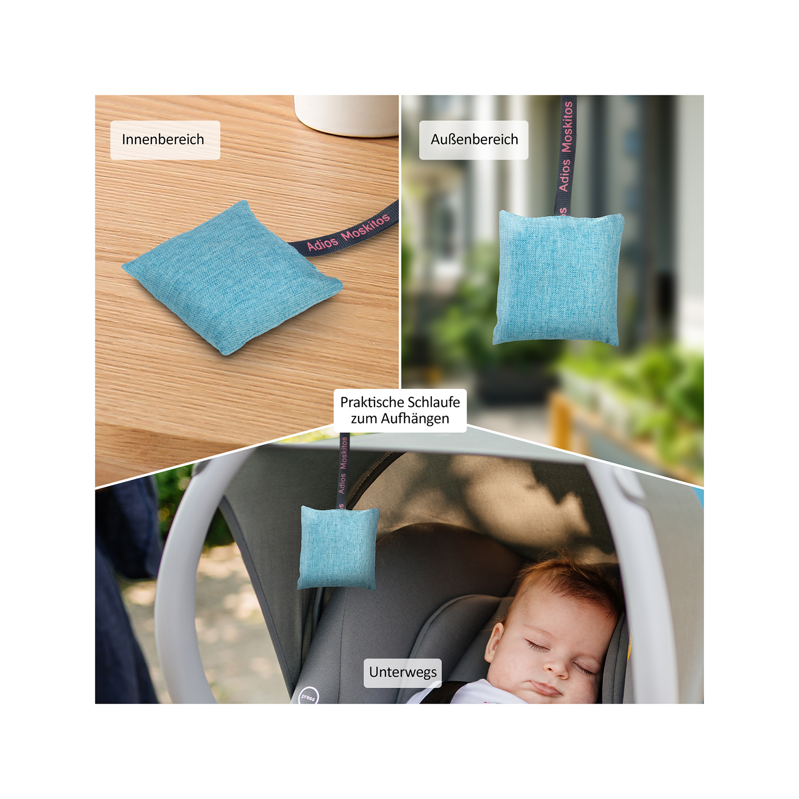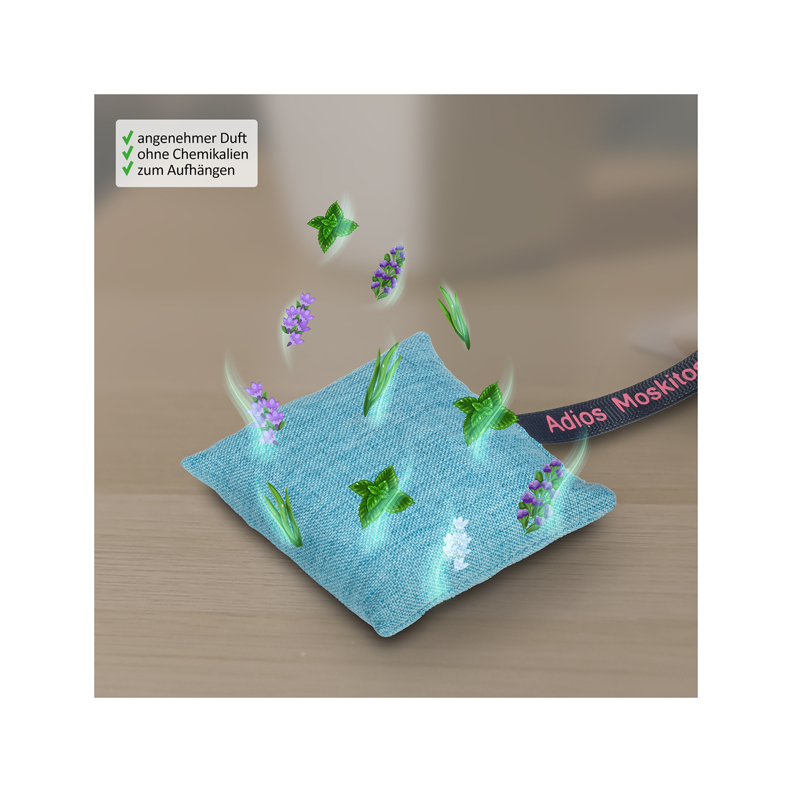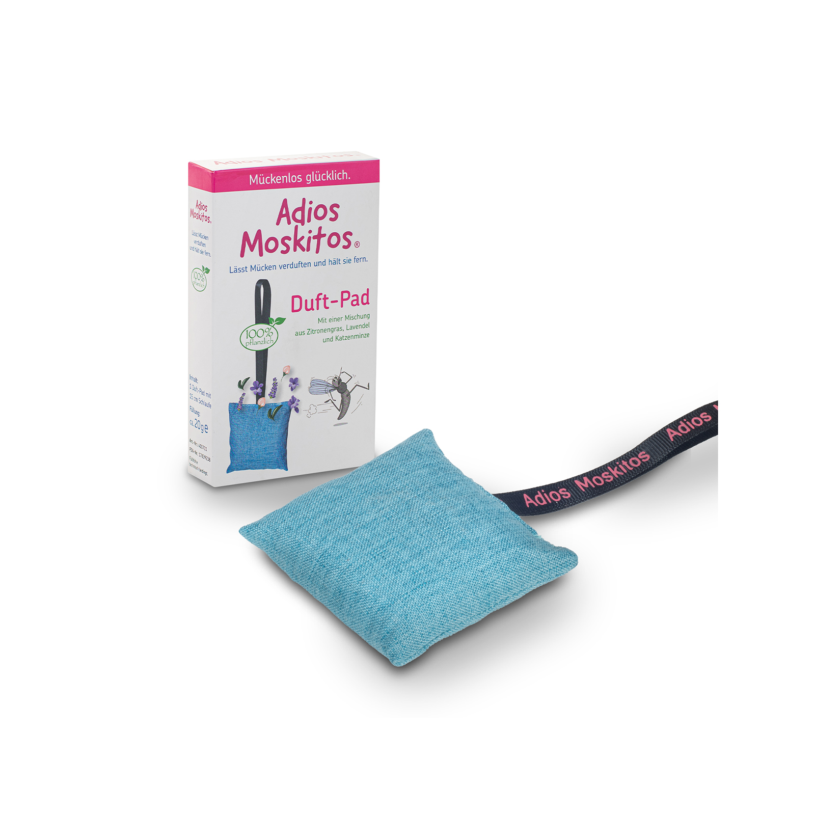 Das Adios Moskitos Duft-Pad basiert auf der Kraft der Natur und besteht deshalb zu 100% aus pflanzlichen Inhaltsstoffen. Es ist gefüllt mit einer sorgfältig ausgewählten Mischung aus getrockneten Kräutern und Blüten. Darin befinden sich Zitronengras, Lavendel und Katzenminze. Während der Duft für uns Menschen angenehm ist, stört er weibliche Stechmücken bei ihrer Suche nach Nahrung und hält sie somit effektiv fern. Auf diese Weise schenkt es Ihnen unbeschwerte Momente im Freien oder in Ihrer Wohnung. Neben der starken pflanzlichen Wirkung ist das Adios Moskitos Duft-Pad auch noch äußerst vielseitig einsetzbar. Dank seiner praktischen Schlaufe kann es problemlos am Kinderwagen, am Schulranzen, an der Sporttasche oder im Wohnwagen angebracht werden. Darüber hinaus eignet es sich natürlich genauso gut für den Einsatz im Wohnzimmer, in der Küche, auf der Terrasse oder dem Balkon – überall dort, wo Sie und Ihre Familie sich vor Mücken schützen möchten.