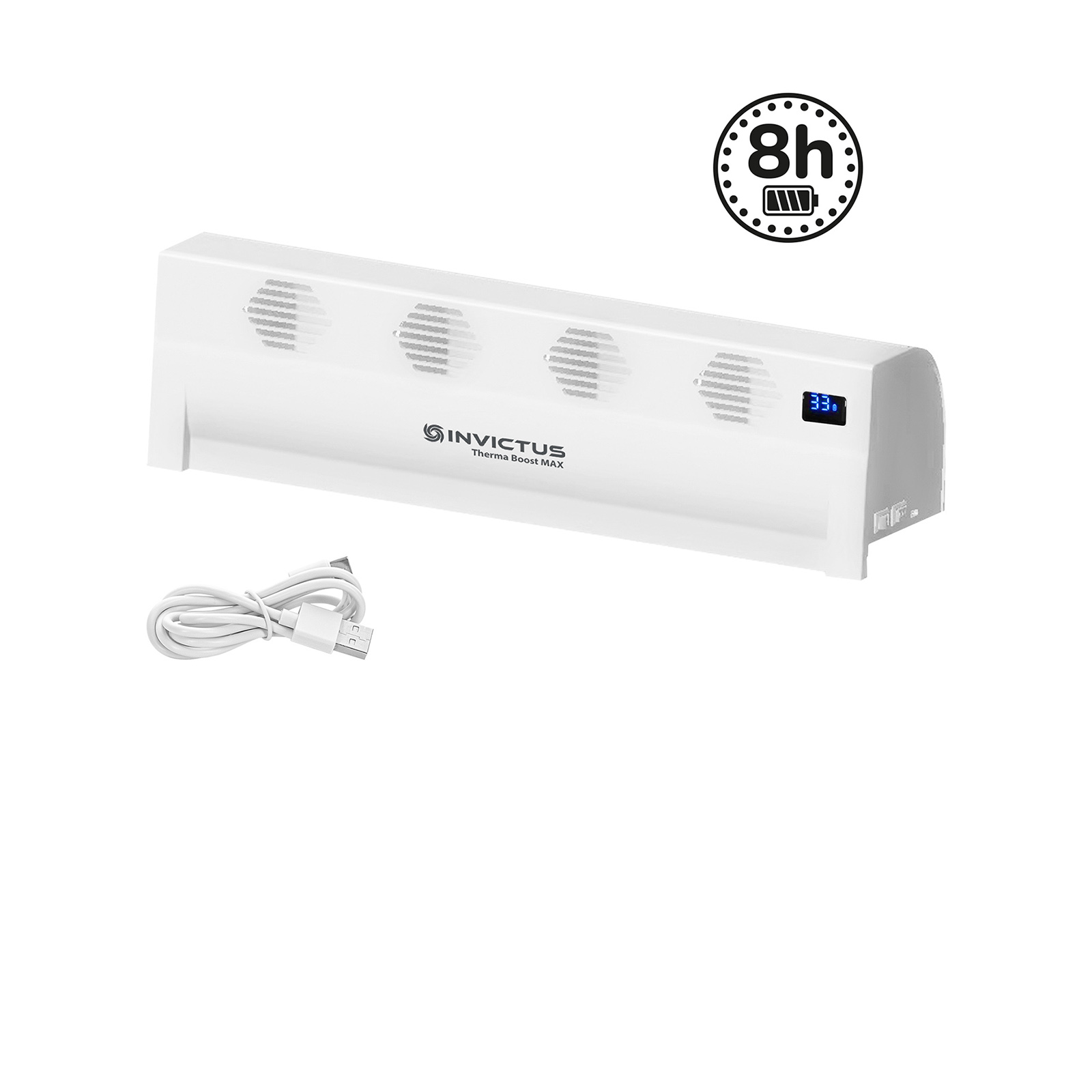 Stellen Sie den Heizungsaufsatz einfach auf den Heizkörper und schon genießen Sie seine Vorzüge. Er verteilt mit seinen vier Lüftungskanälen die warme Luft effizient im Raum. Dadurch sparen Sie Energie und Kosten, da sich das Zimmer schneller ausgeglichen erwärmt und Sie die Heizung nicht so lange laufen lassen müssen. Im kabellosen Betrieb verhilft Ihnen der starke Li-Ion Akku des INVICTUS THERMA BOOST MAX ganze acht Stunden zu einem gleichmäßigeren angenehmen Klima. Durch den separat erhältlichen Netzstecker kann der INVICTUS THERMA BOOST so lange laufen, wie es Ihnen beliebt. Dabei können Sie zwei Stufen einstellen: High und Low. Das integrierte Thermostat sorgt dafür, dass sich der innovative Ventilationsaufsatz von Genius automatisch ein- und ausschaltet, wenn eine gewisse Temperatur erreicht ist. Im Auto-Modus fängt er an zu arbeiten, wenn die Lufttemperatur 33° Celsius beträgt. Unter dieser Grenze schaltet sich der INVICTUS THERMA BOOST MAX von selbst ab. Sie können ihn aber auch im manuellen Modus verwenden. In diesem nutzen Sie das Gerät unabhängig von der Gradzahl. Damit Sie die Temperatur, den eingestellten Modus und den Akkustand immer im Blick haben, bietet Ihnen der Heizungsaufsatz ein praktisches Display.