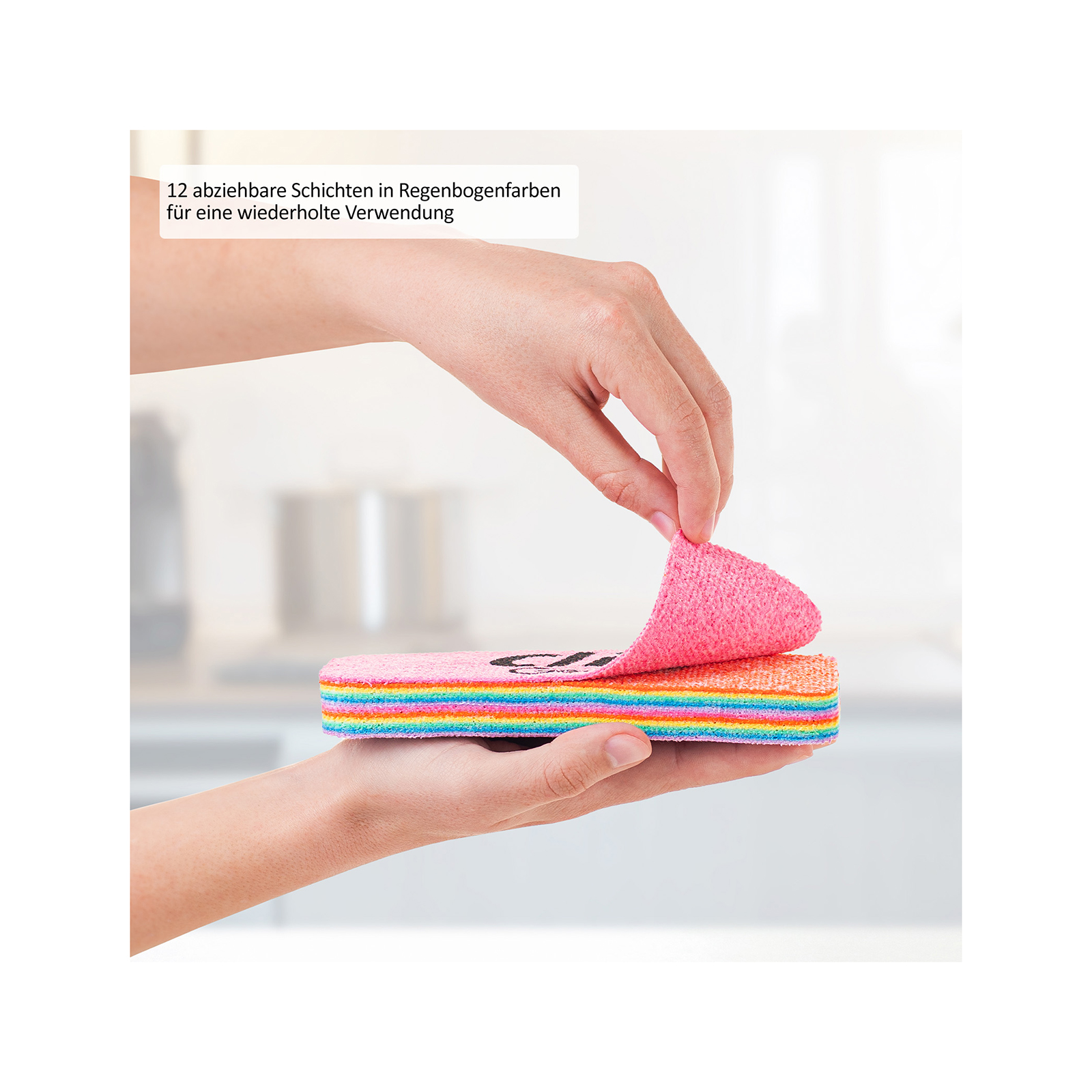 Erleben Sie Putzen in einer neuen Dimension mit dem Clia Rainbow Putzschwamm von Genius – Ihrem vielseitigen Helfer für makellose Sauberkeit. Wischen, schrubben und säubern Sie jegliche Oberflächen und Objekte. Von Geschirr über Tische bis zum Waschbecken im Bad – der Rainbow Putzschwamm verhilft Ihnen in der ganzen Wohnung zu einer einfachen und mühelosen Reinigung. Der Schwamm besteht aus zwölf Schichten, die ihm die namensgebende Rainbow-Farbe verleihen. Jede einzelne Schicht lässt sich abziehen und sorgt so immer wieder für eine frische, saubere Oberfläche des Schwamms. Das bedeutet für Sie: längere Lebensdauer und weniger Abfall!