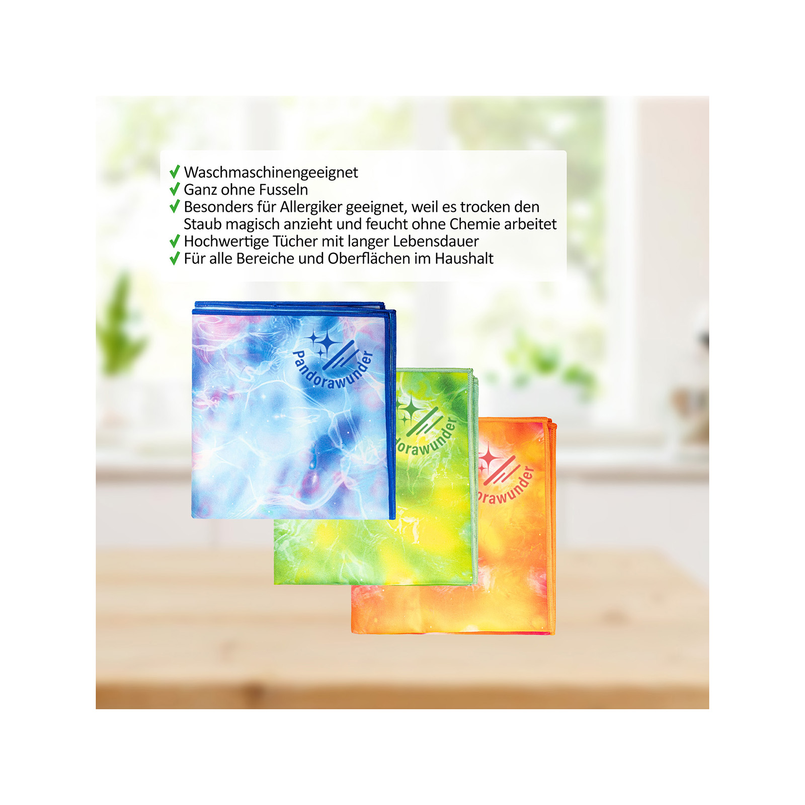 Jedes Tuch ist für unterschiedliche Anwendungen optimiert: das Sauber-Wunder für Möbel und Bildschirme, das Glanz-Wunder für Fenster und Spiegel, das Trocken-Wunder für Geschirr und Küchenflächen und das Pandora-Wunder für empfindliche Materialien wie Kristallgläser oder Hochglanzmöbel.