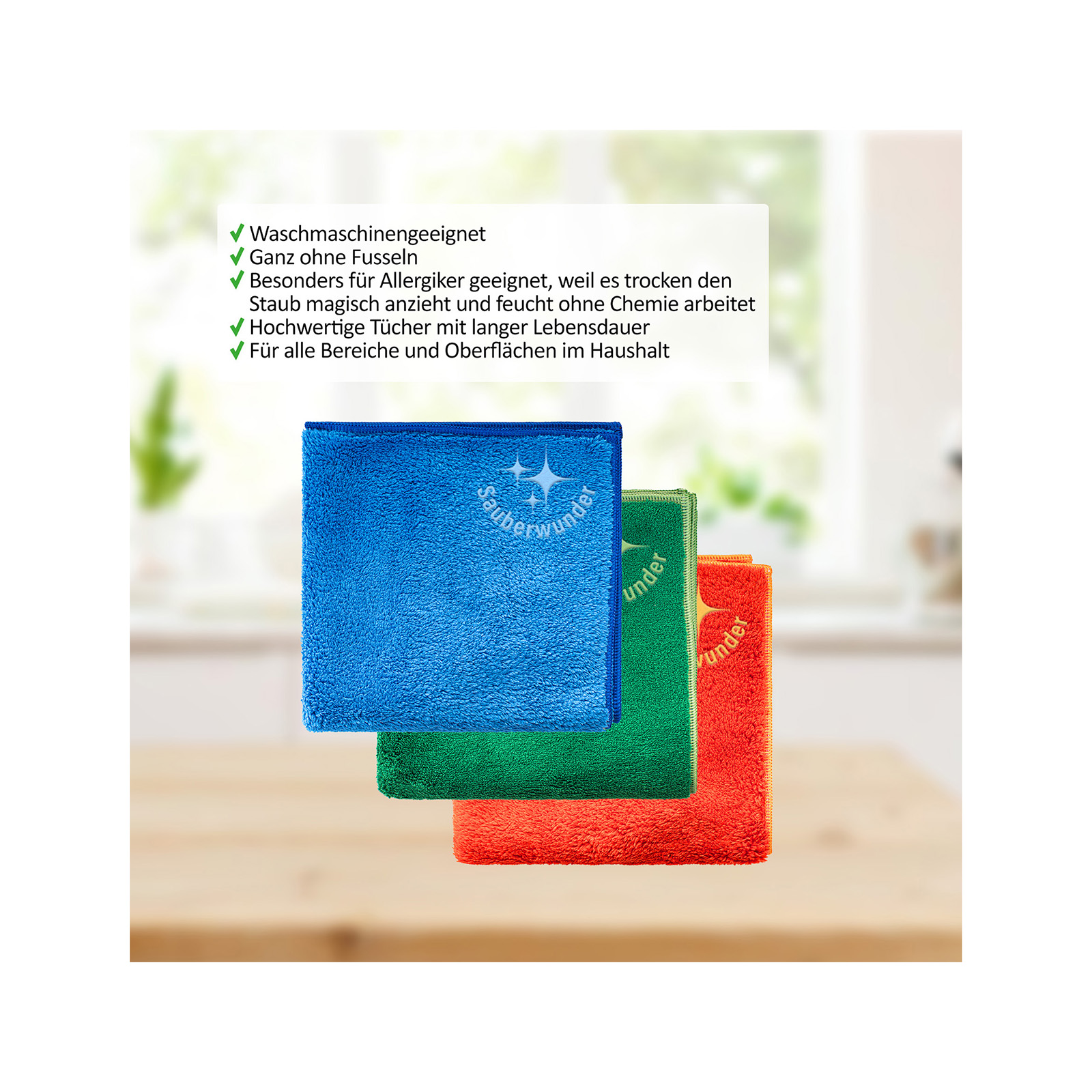 Jedes Tuch ist für unterschiedliche Anwendungen optimiert: das Sauber-Wunder für Möbel und Bildschirme, das Glanz-Wunder für Fenster und Spiegel, das Trocken-Wunder für Geschirr und Küchenflächen und das Pandora-Wunder für empfindliche Materialien wie Kristallgläser oder Hochglanzmöbel.