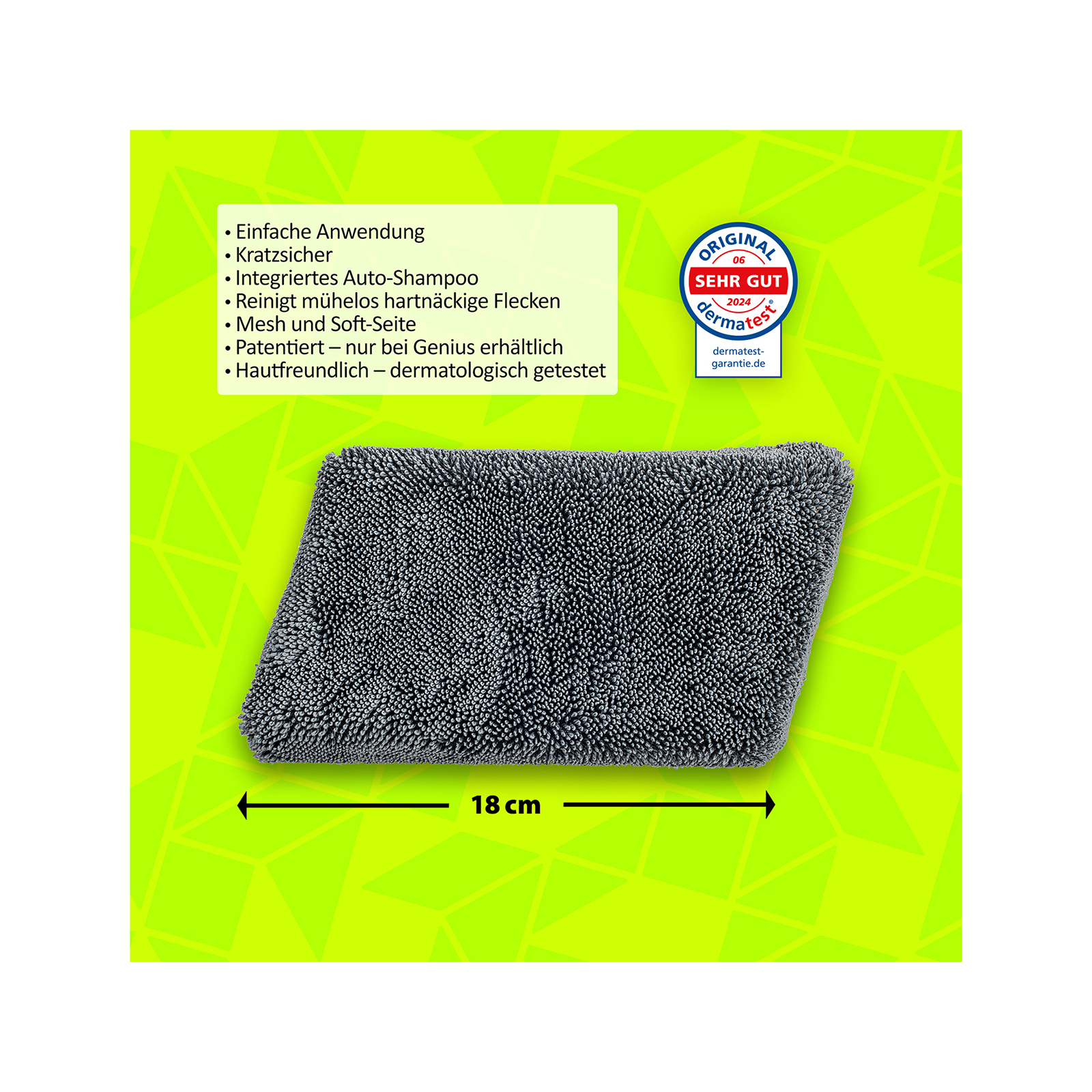 Damit Ihr Auto bei der Reinigung keine Kratzer erleidet, ist der Genius CLIA Genie Auto-Schaum-Schwamm perfekt für empfindliche Oberflächen geeignet. Mit seiner Soft-Seite säubern Sie problemlos Flächen wie Lack, Glas und Spiegel. Machen Sie sich dabei keine Sorgen über Schrammen oder Abschürfungen: Die weiche Seite hinterlässt keine Kratzer. Mit einem sanften Druck auf den Schwamm setzen Sie das beinhaltete Auto-Shampoo frei. Das sorgt für eine gründliche Reinigung, die nicht einfacher oder schonender sein könnte.