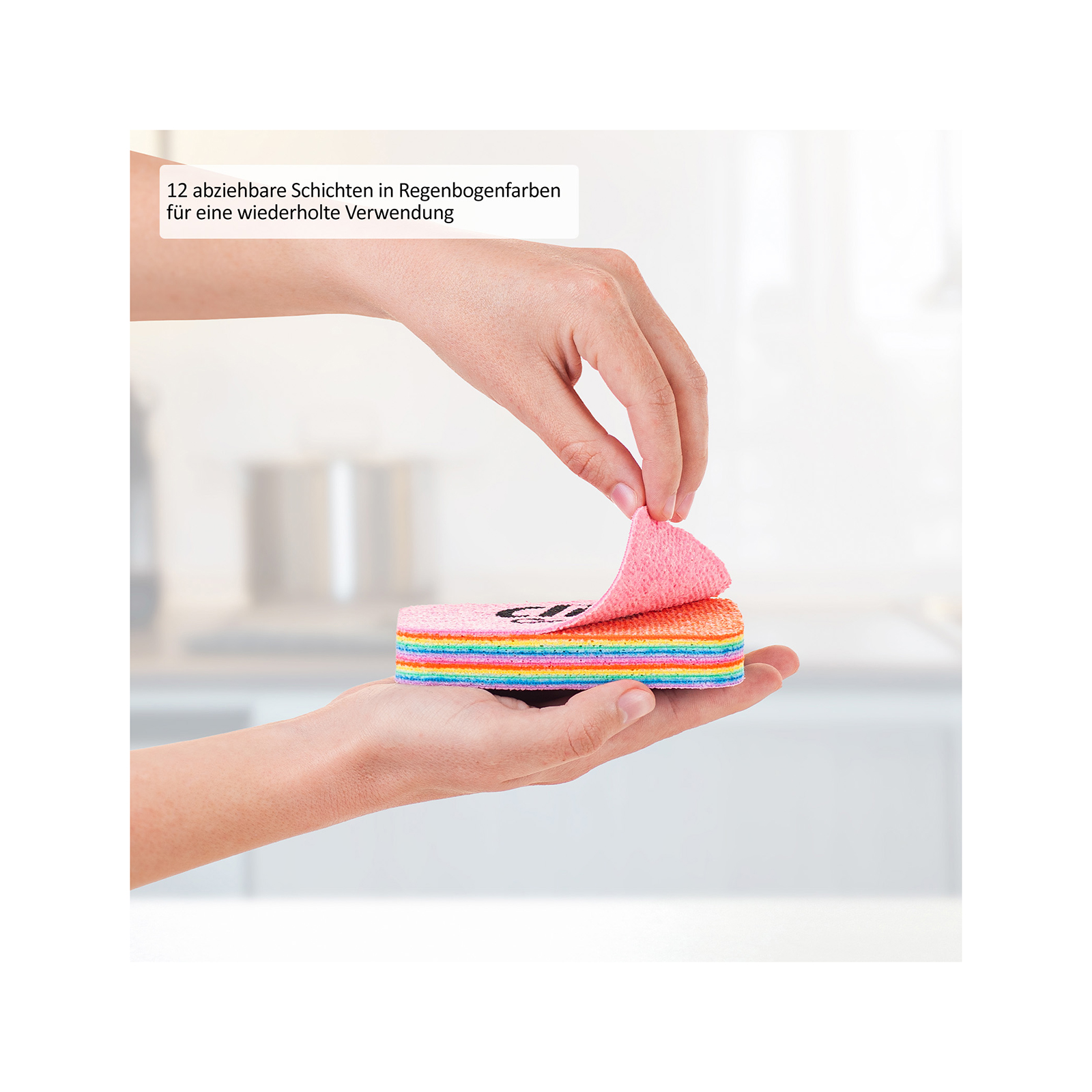 Der CLIA Rainbow Schwamm besteht aus 12 abziehbaren Reinigungsschichten, die einzeln verwendet werden können. So haben Sie mit nur einem Schwamm bis zu zwölf frische, hygienische Putzflächen – ideal für alle Oberflächen im Haushalt.