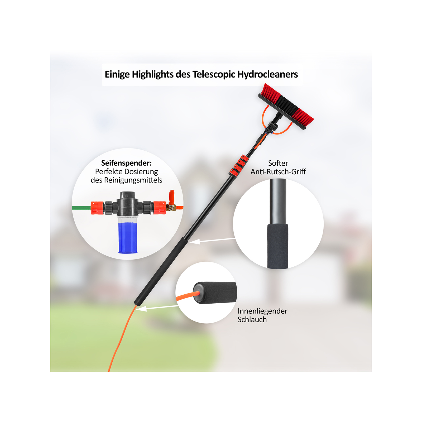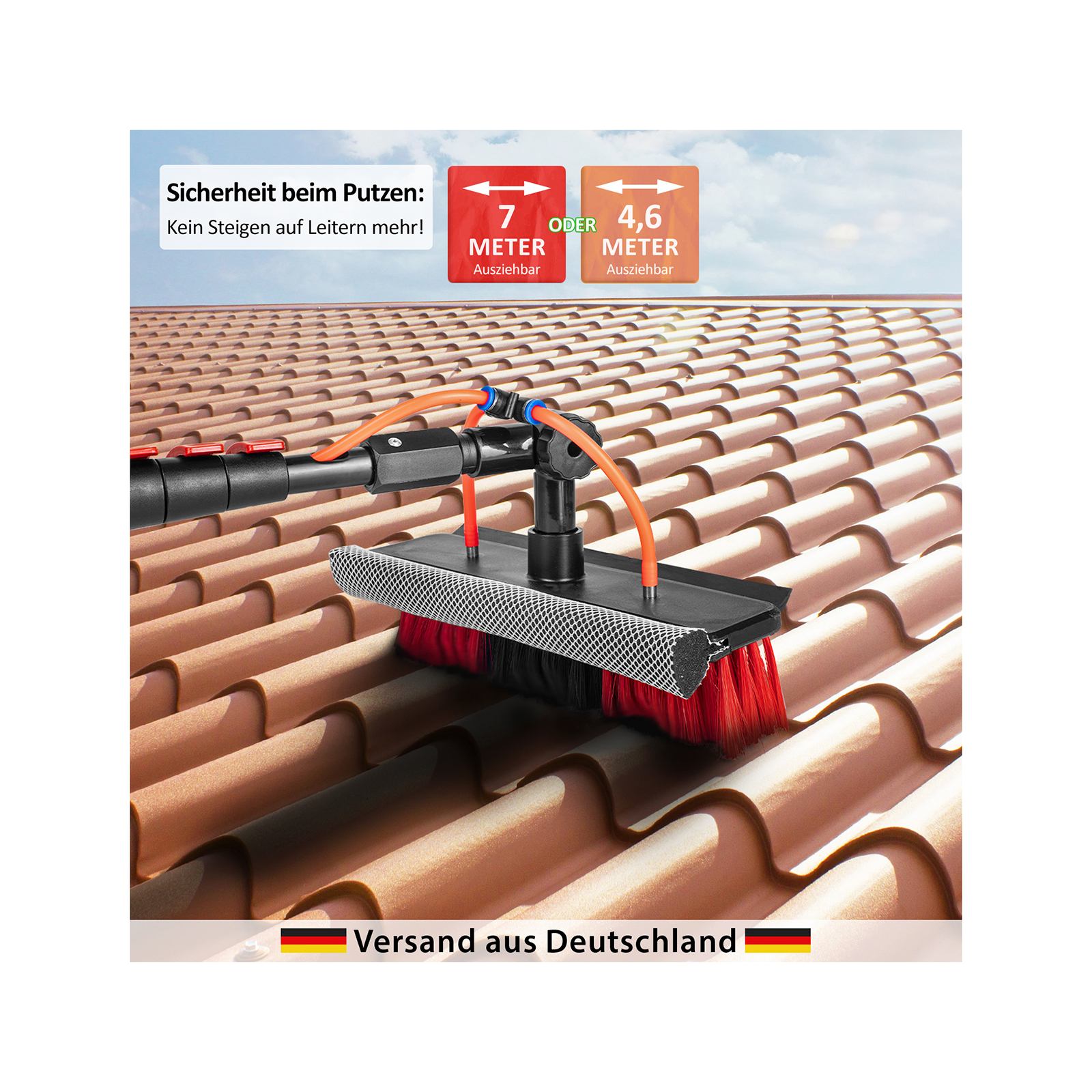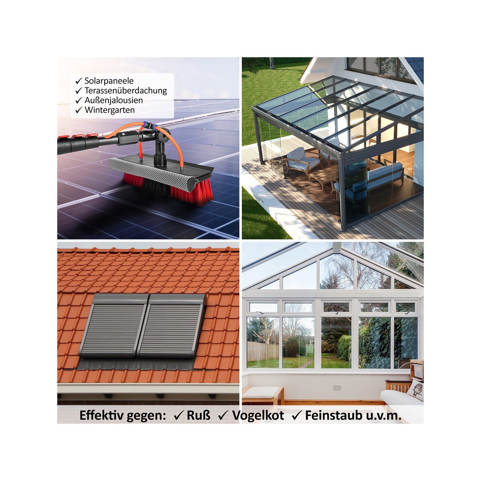 • Vielseitige Anwendung: Reinigung von Dächern, Solarpaneelen, Wänden, Wohnwagen, Autos, hochliegenden Fenstern etc.