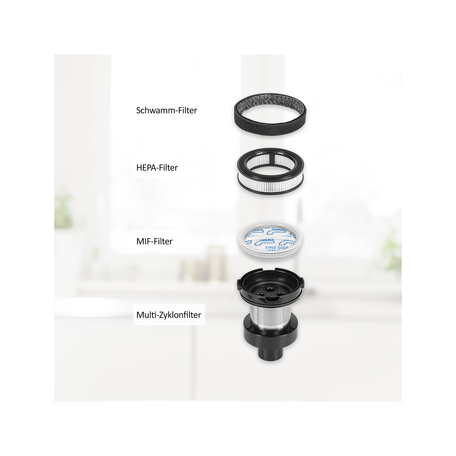 Das Gerät verfügt über ein mehrstufiges Filtersystem mit HEPA-, MIF-, Schwamm- und Zyklonfilter, das selbst feinste Staubpartikel zuverlässig einfängt und für saubere Abluft sorgt.