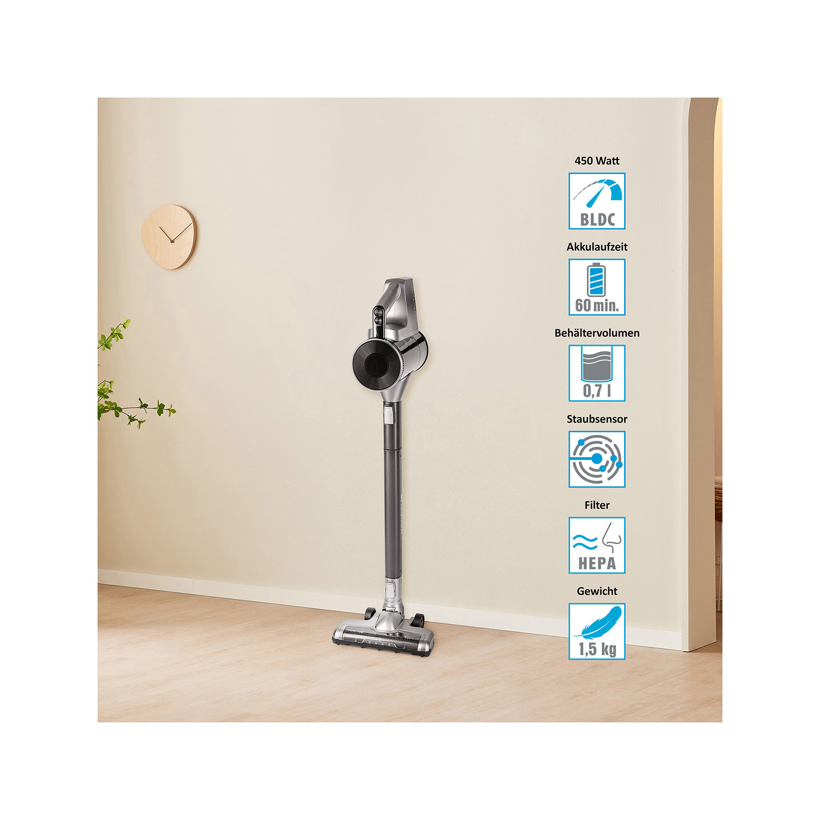 Der Lithium-Ionen-Akku bietet eine lange Laufzeit und ermöglicht eine durchgehende Nutzung von bis zu 60 Minuten, abhängig von der gewählten Saugstufe.