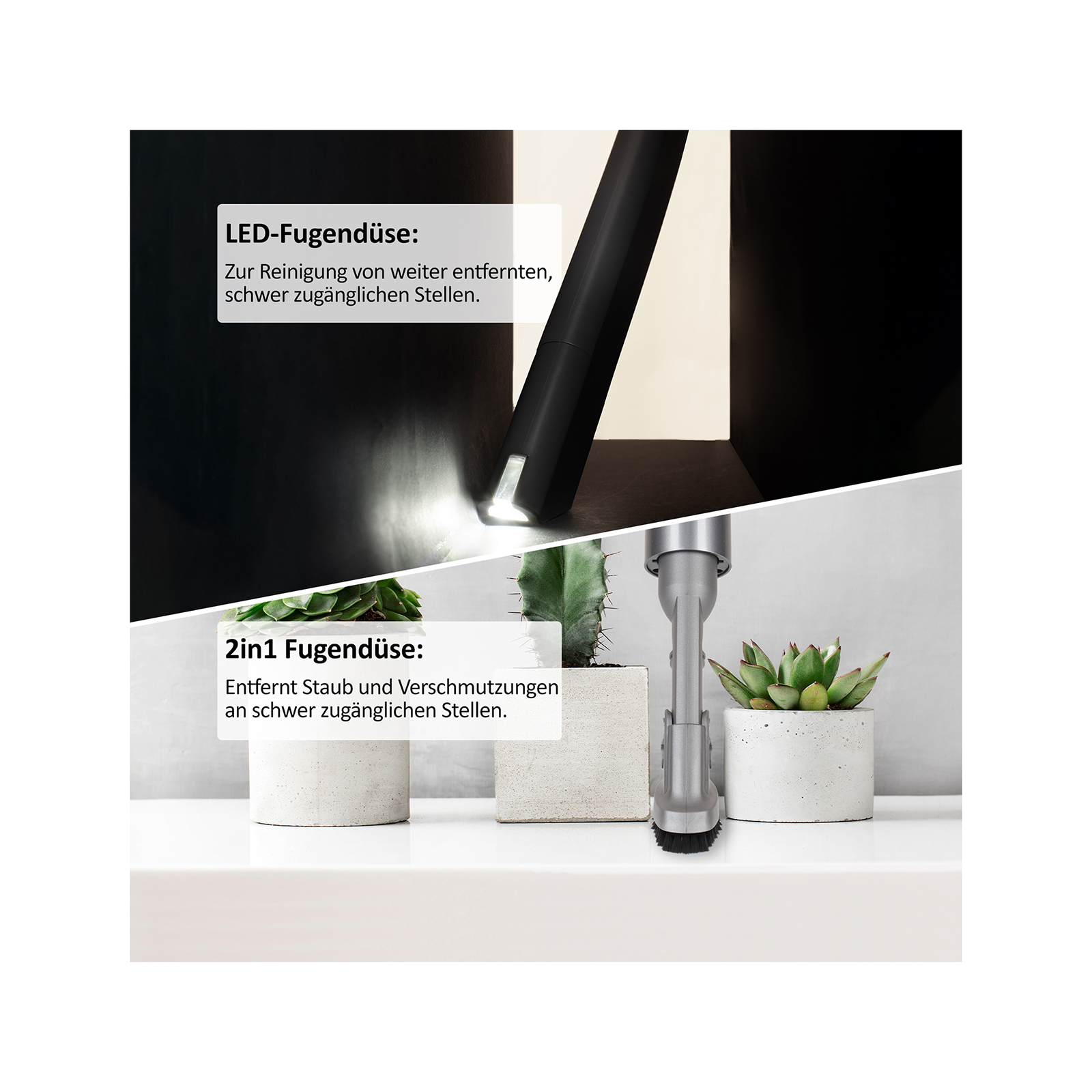 • 2in1 Kombi-Bürste: Für die Reinigung schwer zugänglicher Stellen und empfindlicher Oberflächen