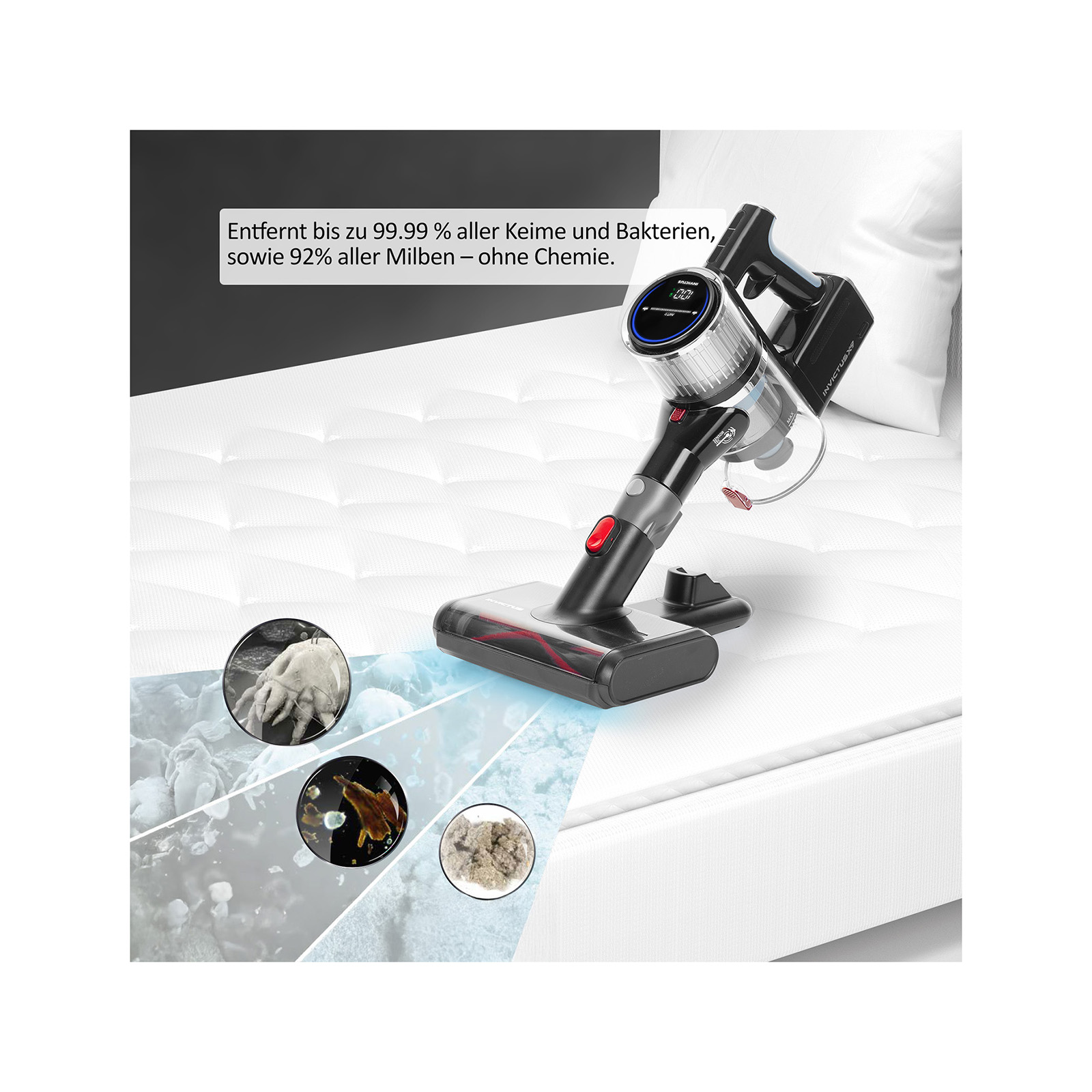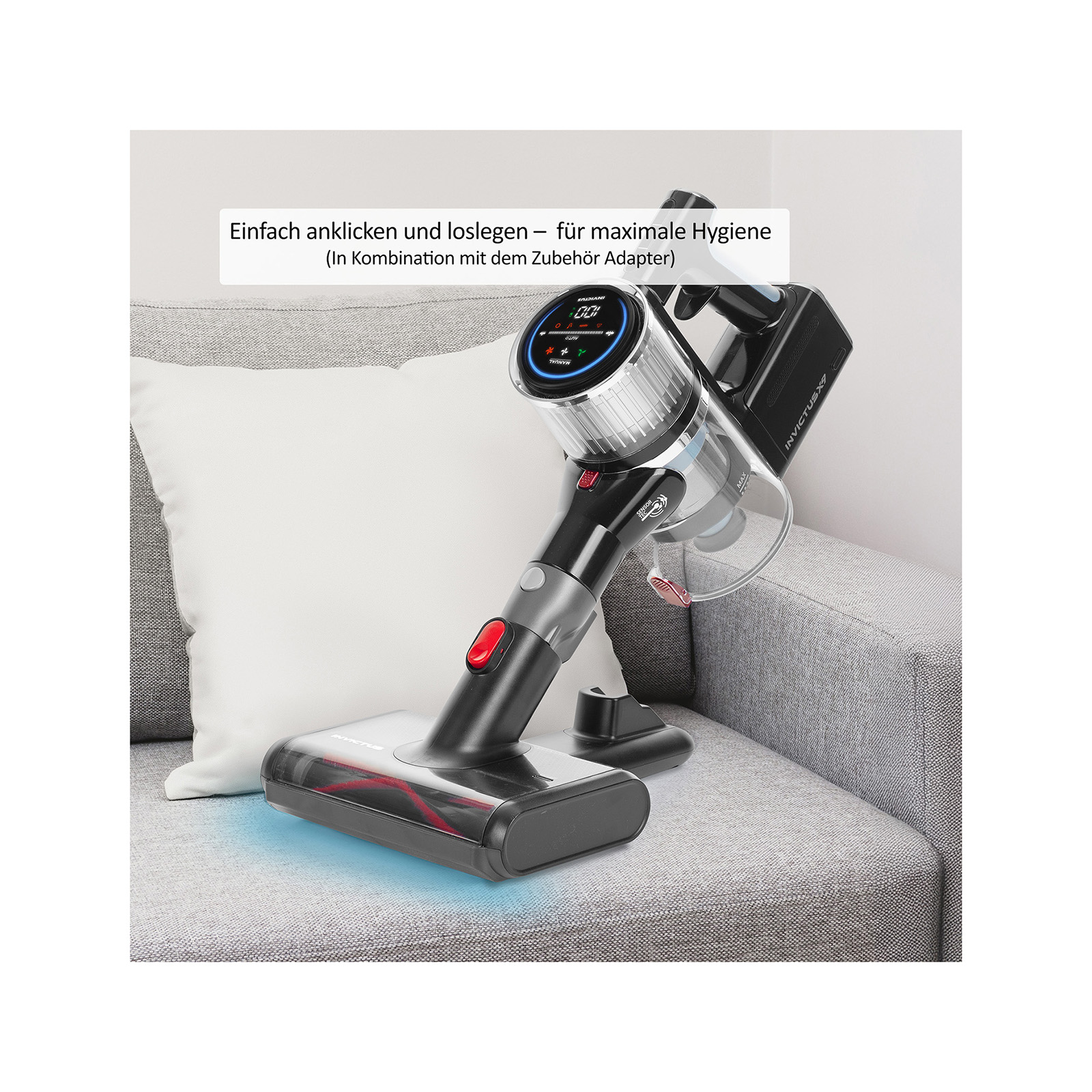 Die UV-Licht Bürste gehört zum innovativen Zubehör des INVICTUS X9/X7/X5. Mit ihr können Staub, Keime, Hausstaubmilben auf Matratzen, Polstern und Teppichen entfernt werden. Das UV-C-Licht kann desinfizierend wirken und das ganz ohne Chemie. So können Sie Ihr Haus schonend aber effektiv reinigen. Die Reinigung der UV-Licht Bürste ist kinderleicht. Einfach die Abdeckung auf der Unterseite entfernen und ausklopfen. Mit dem UV-Licht Bürsten Set erhalten Sie das Gesamtpaket für eine effiziente Tiefenreinigung.