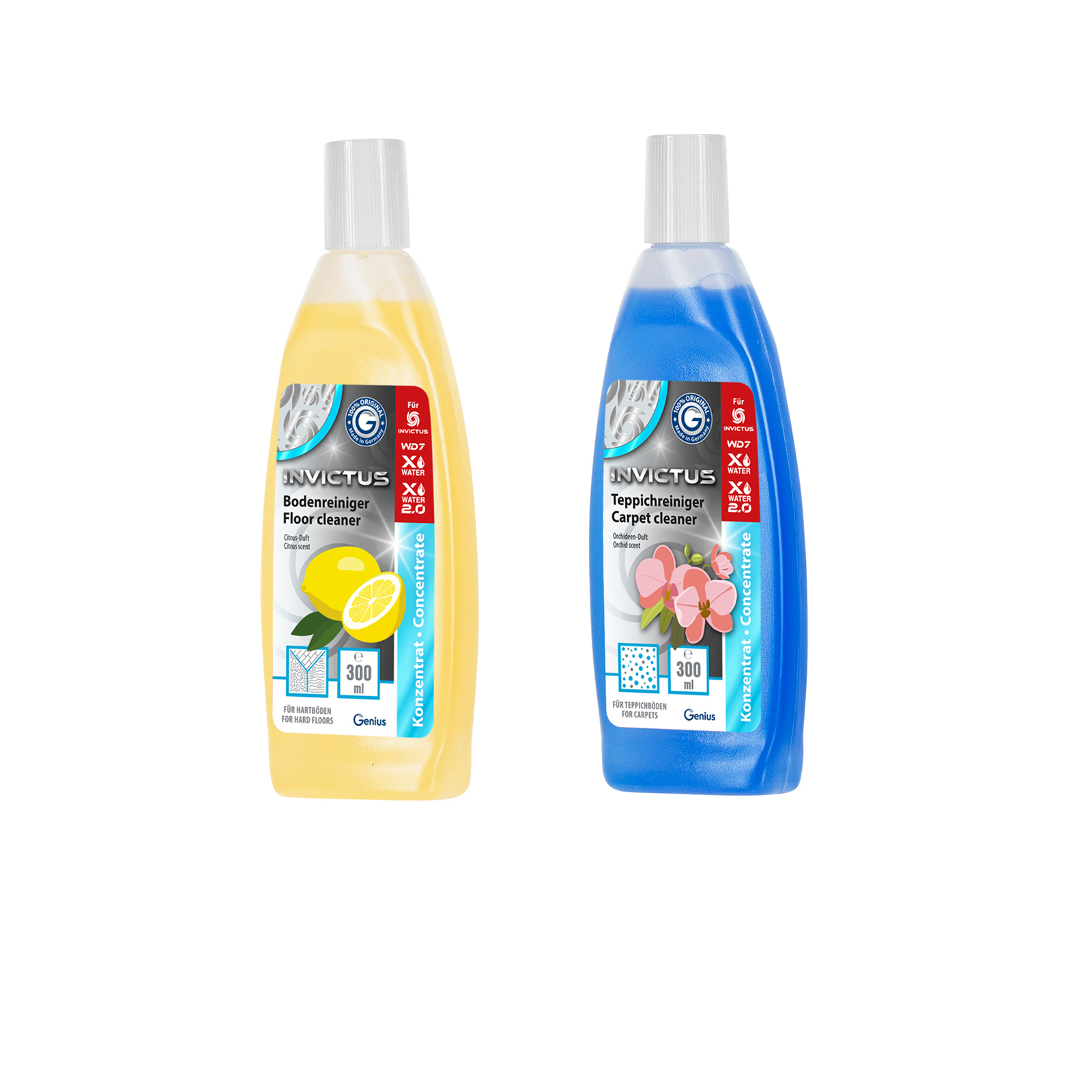 Es ist wieder Zeit zum Putzen und alles steht bereit. Während Sie sich schon auf eine effiziente Reinigung freuen, fällt Ihnen auf, dass Sie sich letztes Mal über das olle Reinigungsmittel geärgert haben, welches noch bei Ihnen zu Hause rumsteht: Es riecht unangenehm künstlich und hinterlässt die Böden einfach nicht streifenfrei und sauber. Lassen Sie das nicht auf sich sitzen und holen Sie sich die INVICTUS Reinigungskonzentrate von Genius! Im vorteilhaften zweiteiligen Set erhalten Sie gleich zwei Konzentrate: einmal das INVICTUS Bodenreiniger Konzentrat und einmal das INVICTUS Teppichreiniger Konzentrat. Mit beiden bewaffnet sagen Sie Staub und Schmutz gekonnt den Kampf an – auf allen Arten von Böden. Füllen Sie die Konzentrate einfach in Ihr Reinigungsgerät ein und das effiziente Putzen kann losgehen. Die innovativen Reinigungskonzentrate sind eine perfekte Ergänzung für den INVICTUS WD7, X Water oder X Water 2.0.