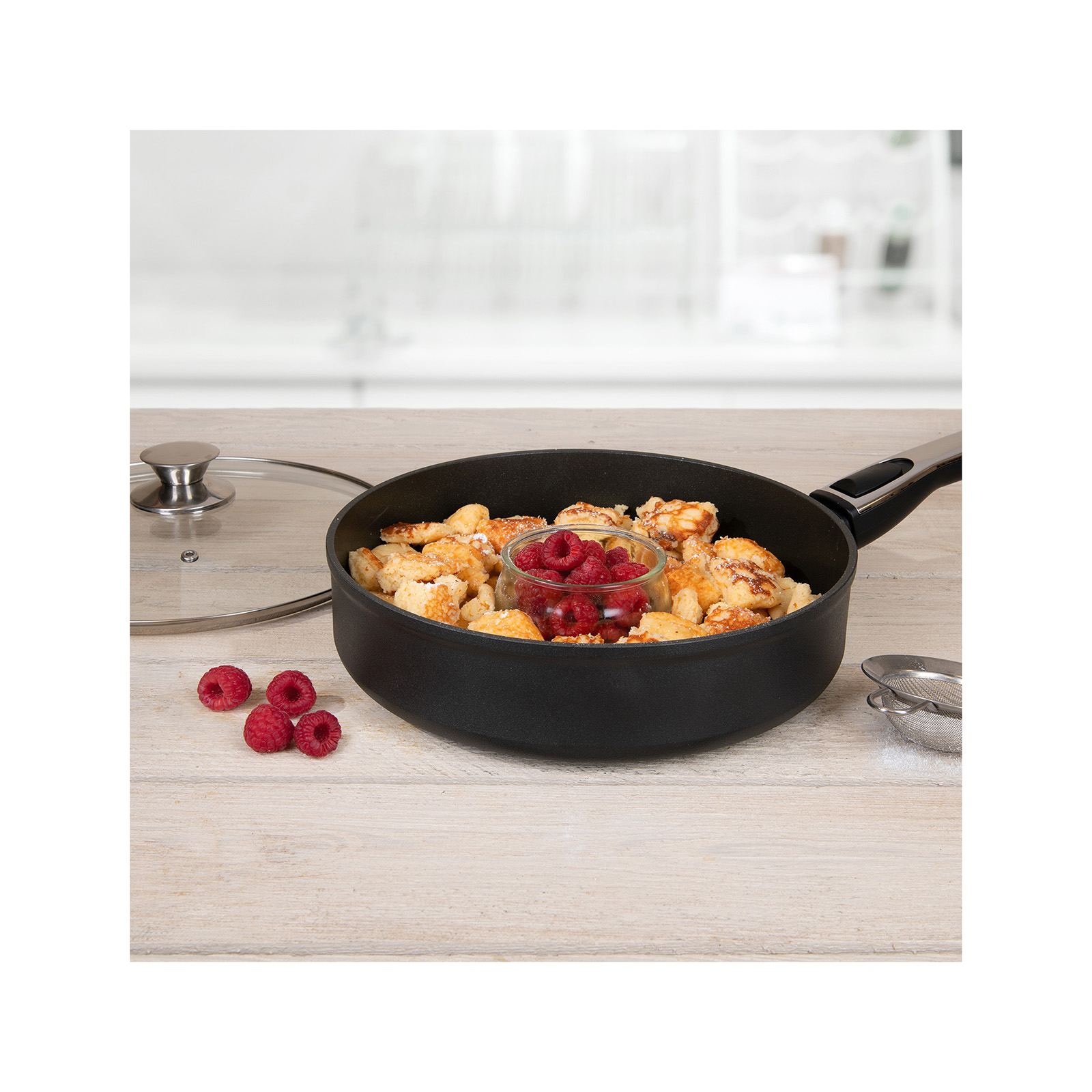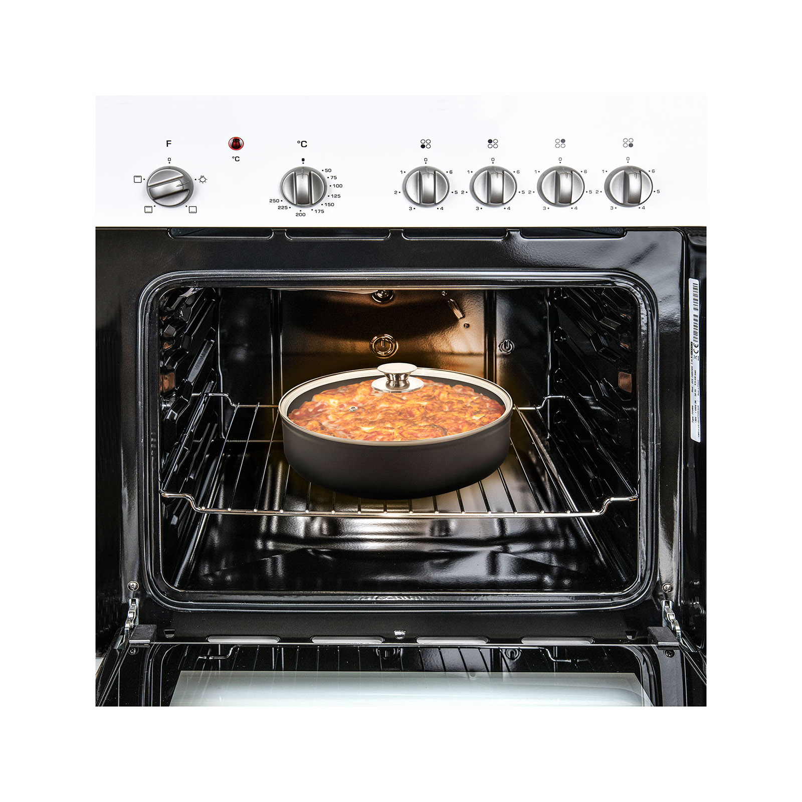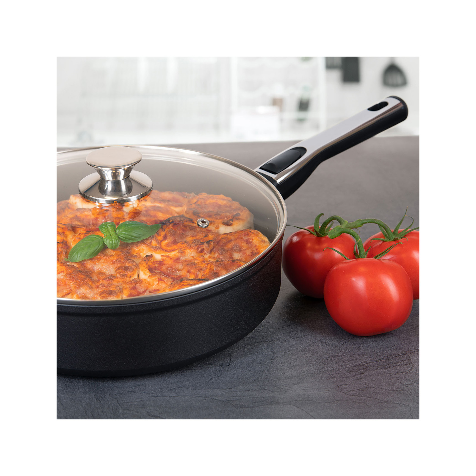 • Backofengeeigneter Glasdeckel mit Edelstahlknauf