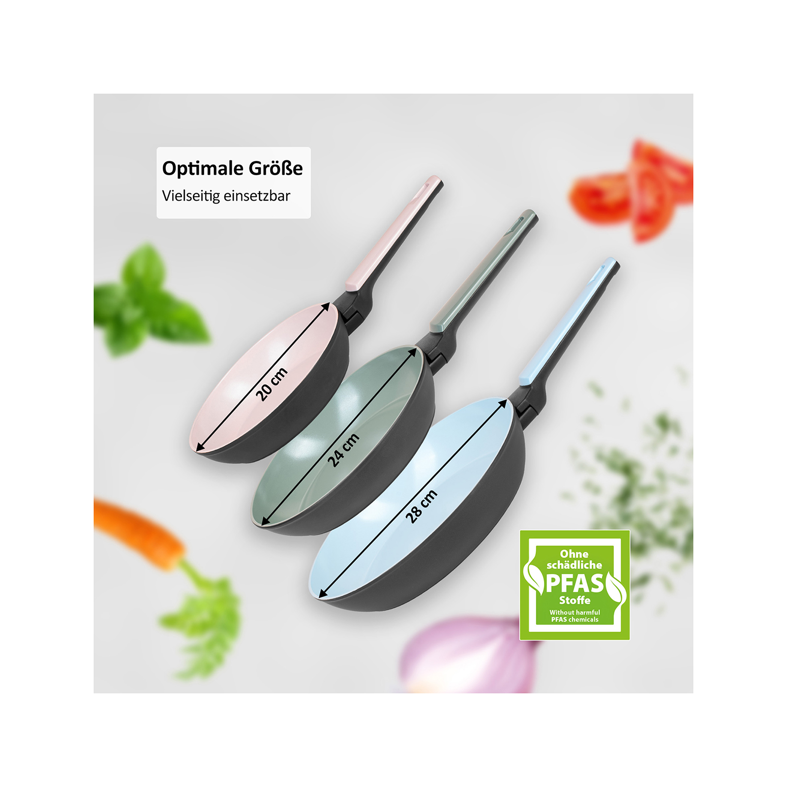 So leicht wie die ansprechenden Pastelltöne der Cerafit Trend Pfannen ist auch das Kochen und Braten mit ihnen. Sie sind ideal für den täglichen Gebrauch: Dank der drei unterschiedlichen Größen im 3-teiligen Set können Sie immer das passende Modell aussuchen und beispielsweise Rührei zum Frühstück, eine Reispfanne oder ein leckeres Steak zubereiten. Die Möglichkeiten sind mit den Durchmessern von 20 cm, 24 cm und 28 cm nahezu grenzenlos. Und nicht nur das Set überzeugt – die einzelnen Pfannen haben es auch in sich! Jede davon ist aus hochwertigem Edelstahl und Aluminium gefertigt und wird durch eine schadstofffreie Keramikbeschichtung ergänzt. Dadurch genießen Sie sorgloses Kochen ohne PFAS-Chemikalien und gleichzeitig hervorragende Antihafteigenschaften. Nichts bleibt an der Pfanne kleben und brennt an. Sie können darin sogar Lebensmittel ohne Öl oder Fett anbraten. Die Beschichtung macht so ein gesundes Kochen möglich, bei dem Sie sich außerdem keine Gedanken um Kratzer machen müssen. Das Material ist robust und hitzebeständig, wodurch die Pfanne immer in Form bleibt und Ihnen zuverlässig beim Braten diverser Zutaten hilft.