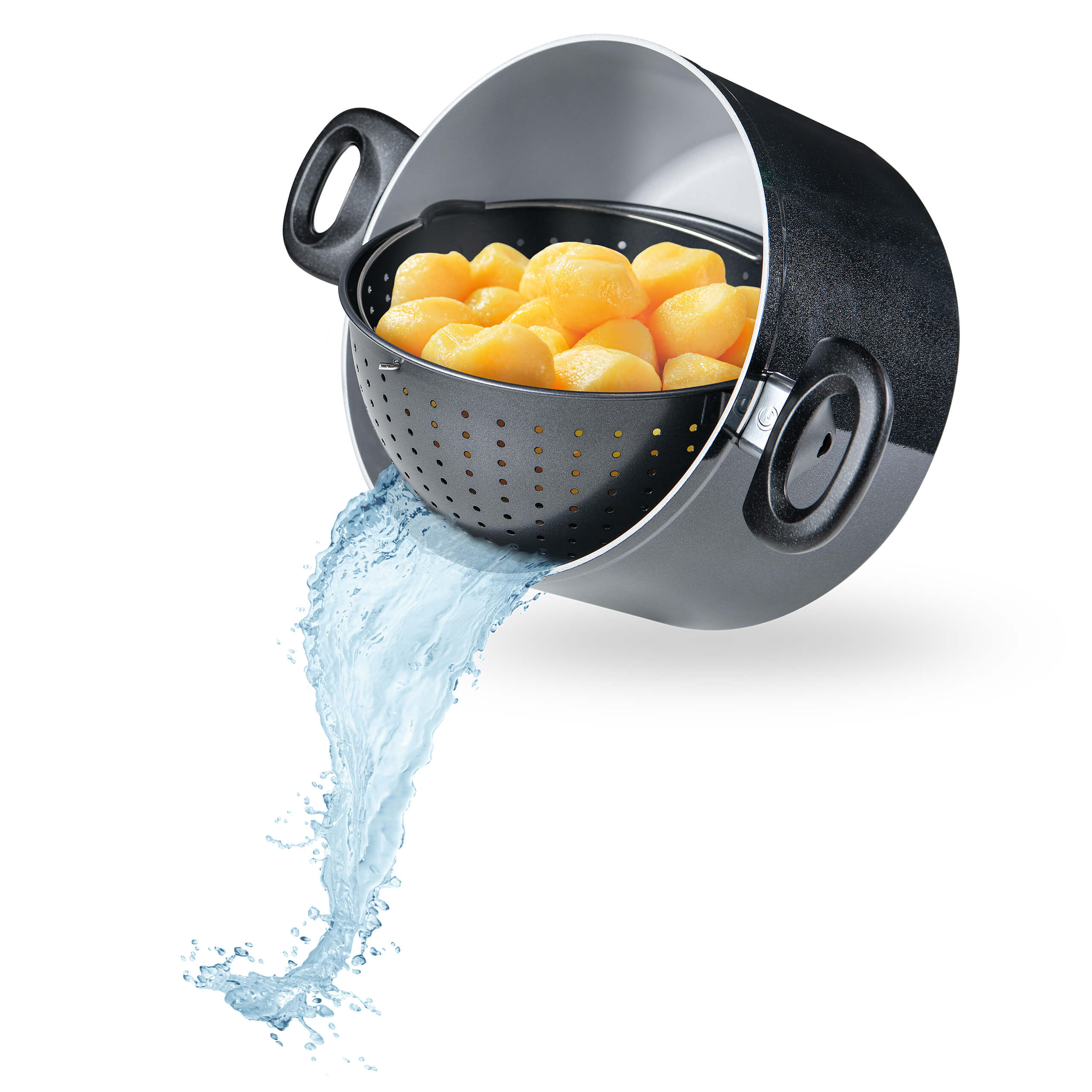 • Kochtopf mit integriertem, schwenkbarem und herausnehmbarem Sieb – für leichtes Abgießen
