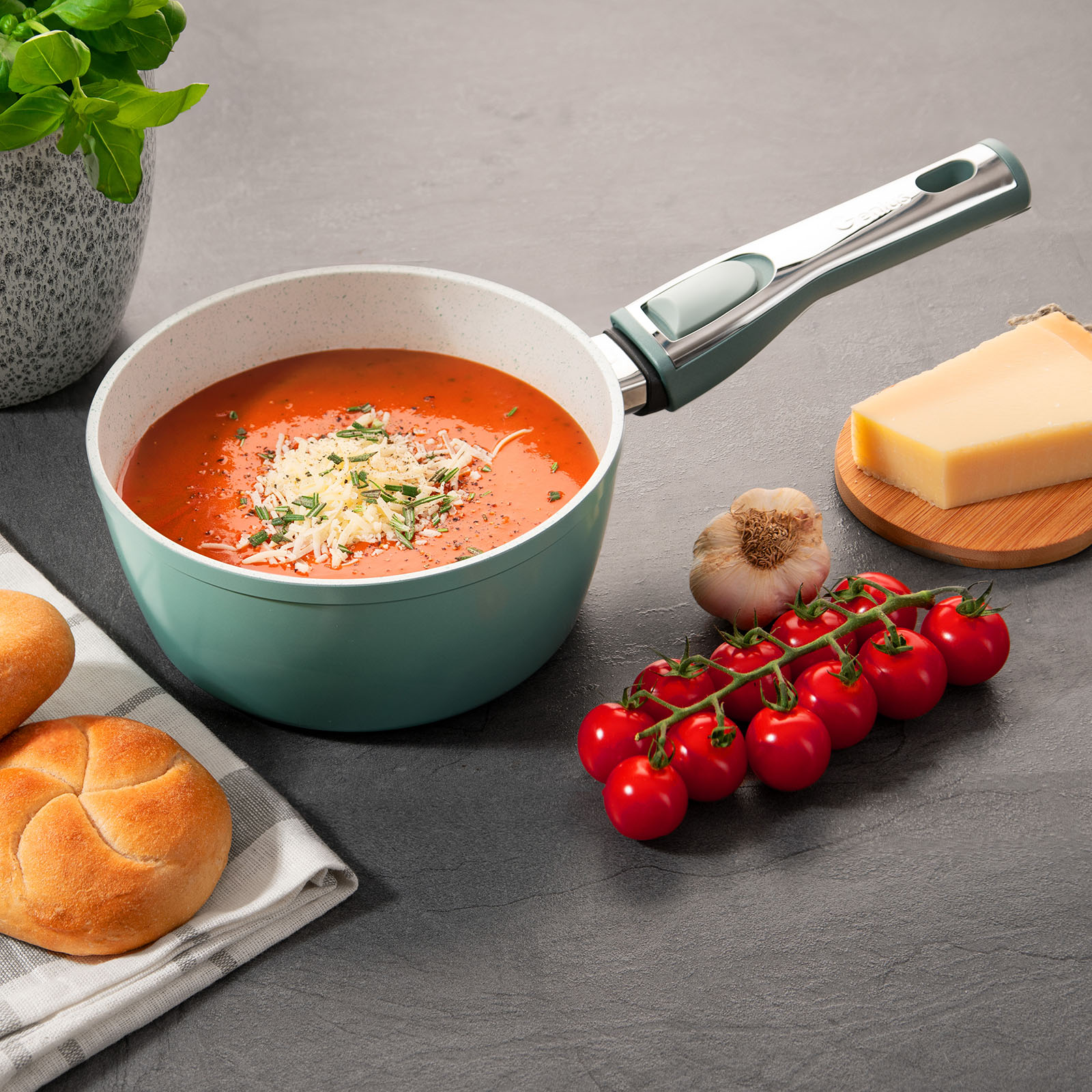 Entdecken Sie die Cerafit Revolution Stielkasserolle mit 18 cm Durchmesser von Genius! Ihre innovative ThermoSpeed-Induktions-Technologie bereichert Ihr Kocherlebnis mit einer ausgezeichneten Wärmeverteilung und Formbeständigkeit. Ihre Speisen erhitzen Sie dadurch ausgeglichen und die Stielkasserolle bleibt stets in Form. Dabei können Sie sie auf allen Herdarten verwenden. Der lange Griff und der hohe Rand machen es ganz einfach, Soßen und andere Gerichte ohne Spritzen oder Überkochen zuzubereiten. So macht Kochen wieder Spaß! Die Cerafit Revolution Stielkasserolle ist mit einer neuen und extrem langlebigen Keramik-Beschichtung ausgestattet. Durch diese gehört schnelles Anbrennen von Speisen der Vergangenheit an. Frei von PFAS-Chemikalien sorgt die Beschichtung für bis zu 300 Prozent bessere Antihafteigenschaften als einer der führenden Hersteller für Keramik-Beschichtungen. Dadurch bereiten Sie Ihre Lieblingsgerichte auch ohne Öl oder Fett zu. Und nach dem Essen brauchen Sie sich nicht um den Abwasch zu kümmern. Die Cerafit Revolution Stielkasserolle von Genius ist spülmaschinengeeignet.