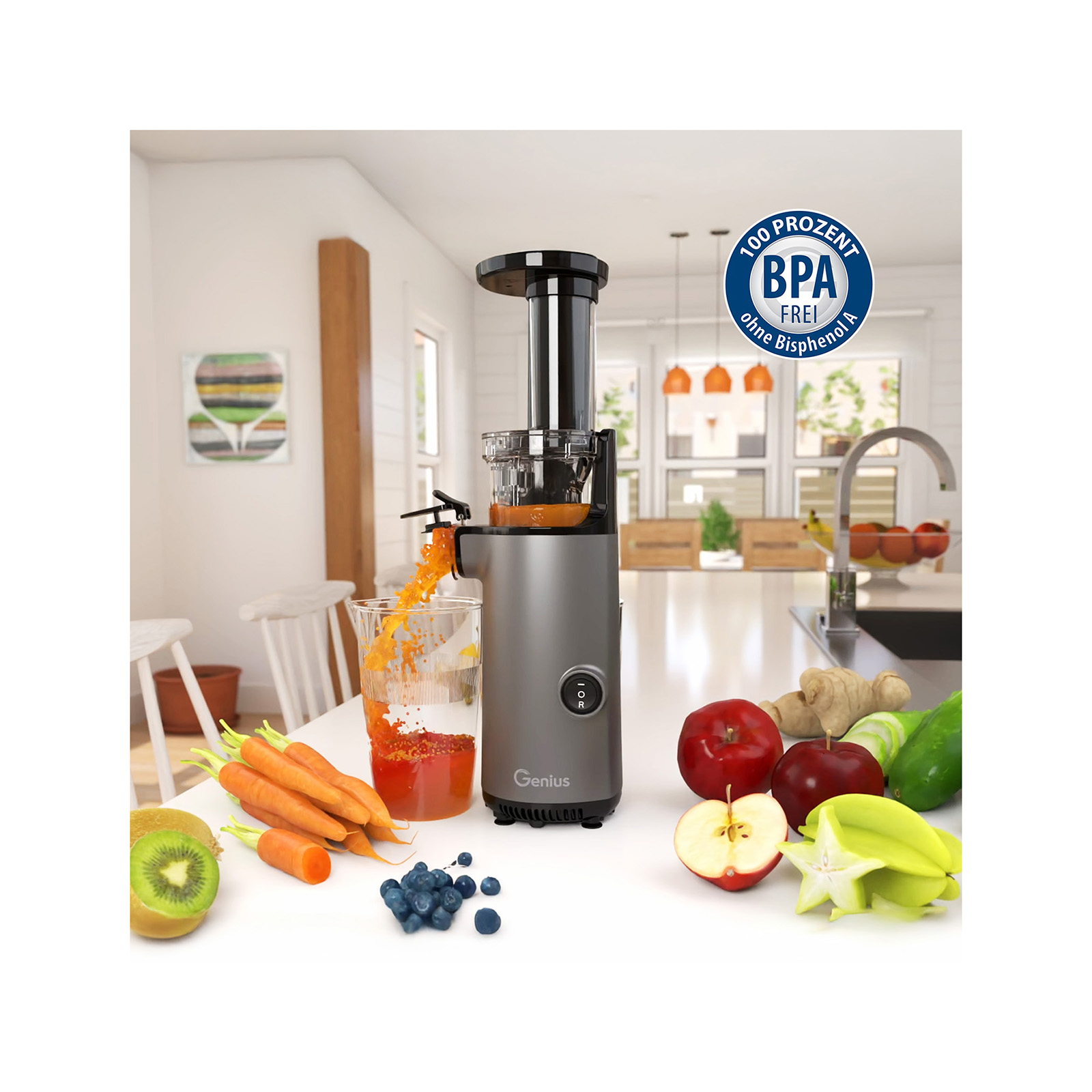 Sicherheit steht an erster Stelle: Die verwendeten Materialien sind deshalb BPA-frei, sodass Sie unbesorgt leckere und gesunde Säfte genießen können. Sie haben die volle Kontrolle darüber, was in Ihrem Saft landet. Mit einer Lautstärke von unter 68 Dezibel arbeitet der Slow Juicer zudem angenehm leise. Auf diese Weise können Sie köstlichen Saft ohne Lärm herstellen, wenn Sie morgens nach dem Aufstehen niemanden wecken, aber ein frisches Getränk trinken wollen. Kaufen Sie sich jetzt den Genius Slow Juicer Mini und erleben Sie gesunden Genuss, wann immer Sie möchten!