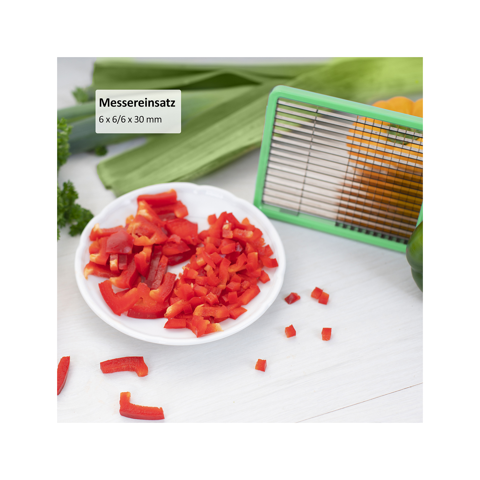 • Messereinsatz 6 x 6 mm/6 x 30 mm – das „Zwiebelmesser“! Für 2-in-1 Schneiden von kleinen Würfeln/Stiften und Streifen/Scheiben!