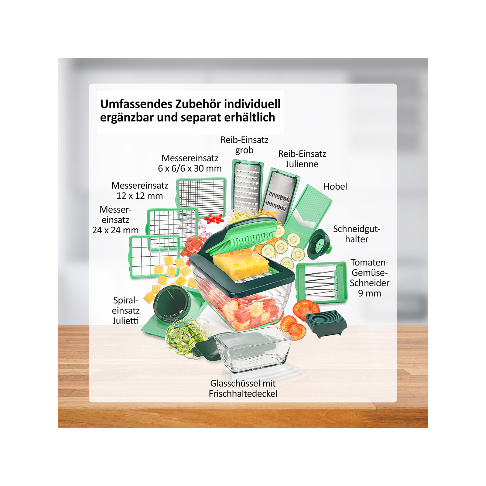 Nicer Dicer Chef S | Set 7-tlg. Nicer Dicer Chef S Glasschüssel | Set 3-tlg. Grün Nicer Dicer Chef S Glasschüssel | Set 3-tlg. Aubergine Nicer Dicer Chef S Glasschüssel | Set 3-tlg. Orange Nicer Dicer Chef S Premium | Set 5-tlg.