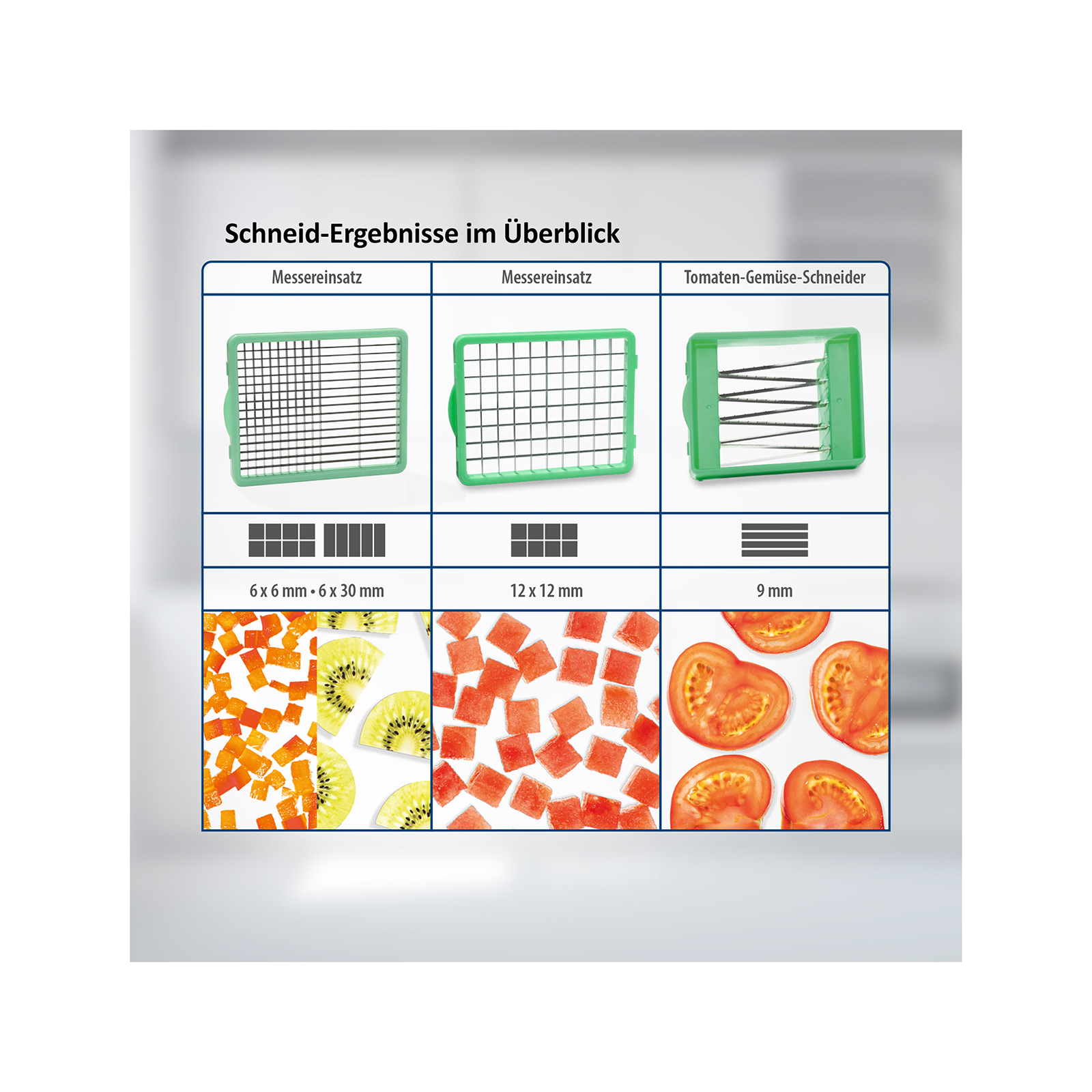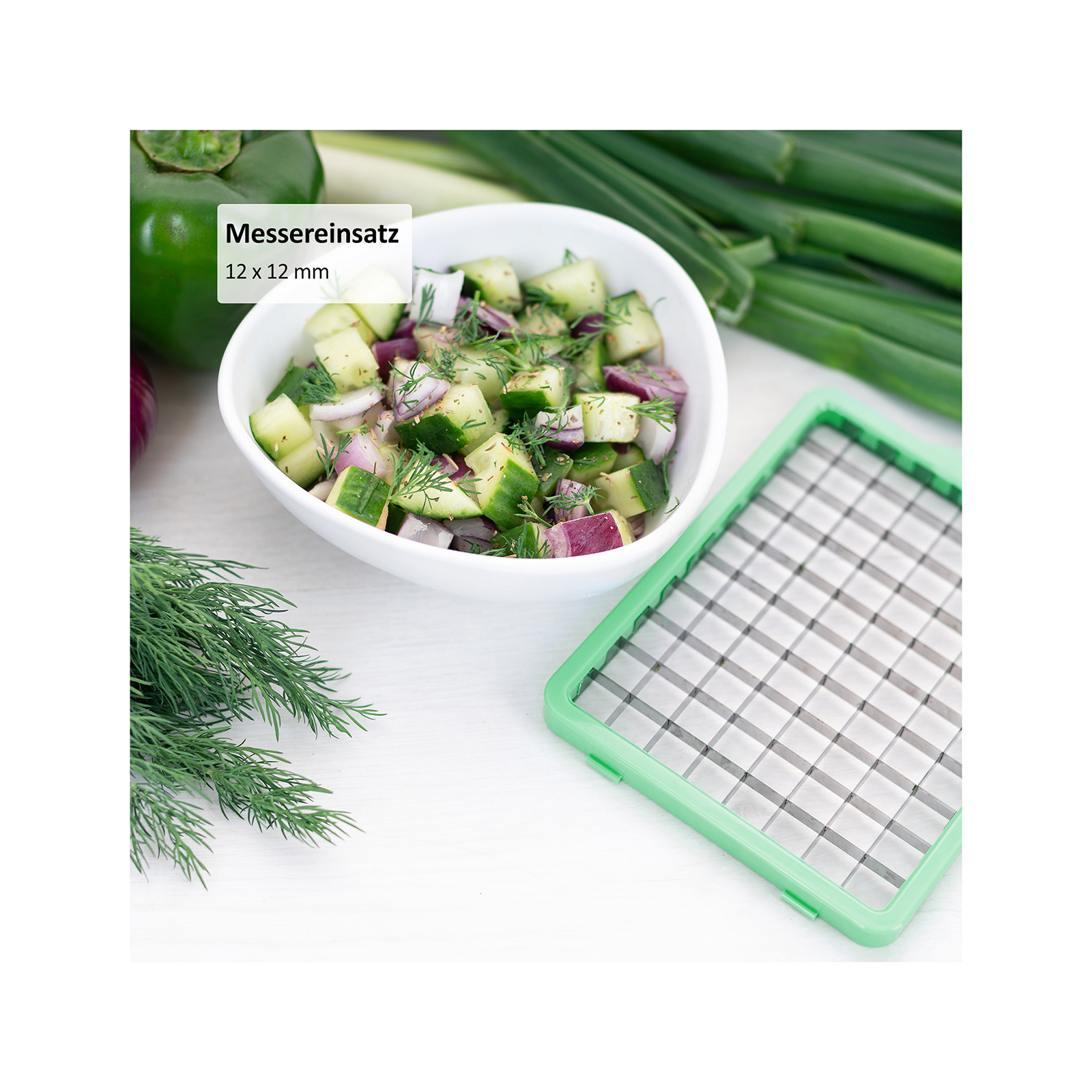 • Messereinsatz 12 x 12 mm – zum Schneiden von mittleren Würfeln/Stiften für Gerichte aller Art!