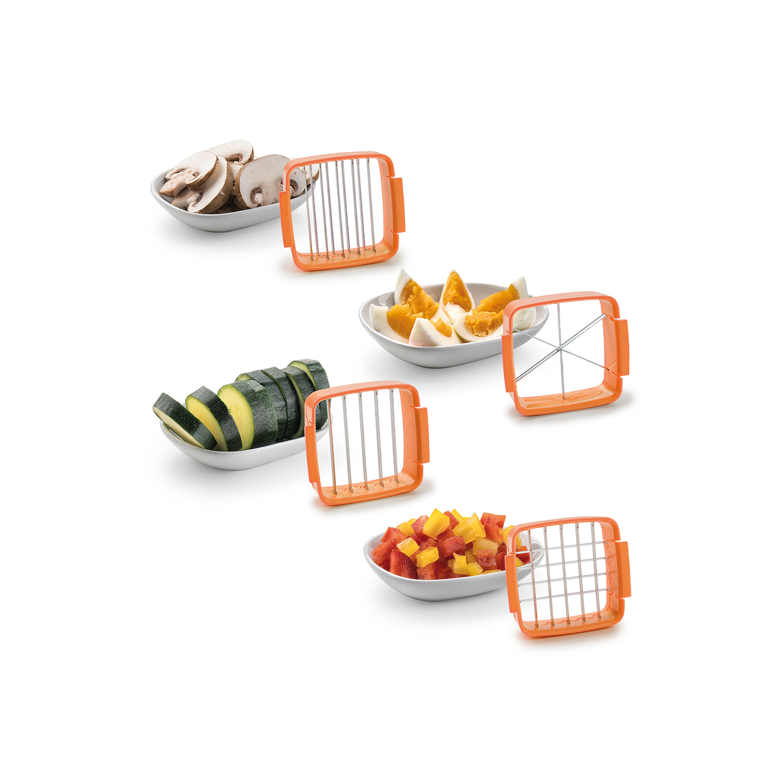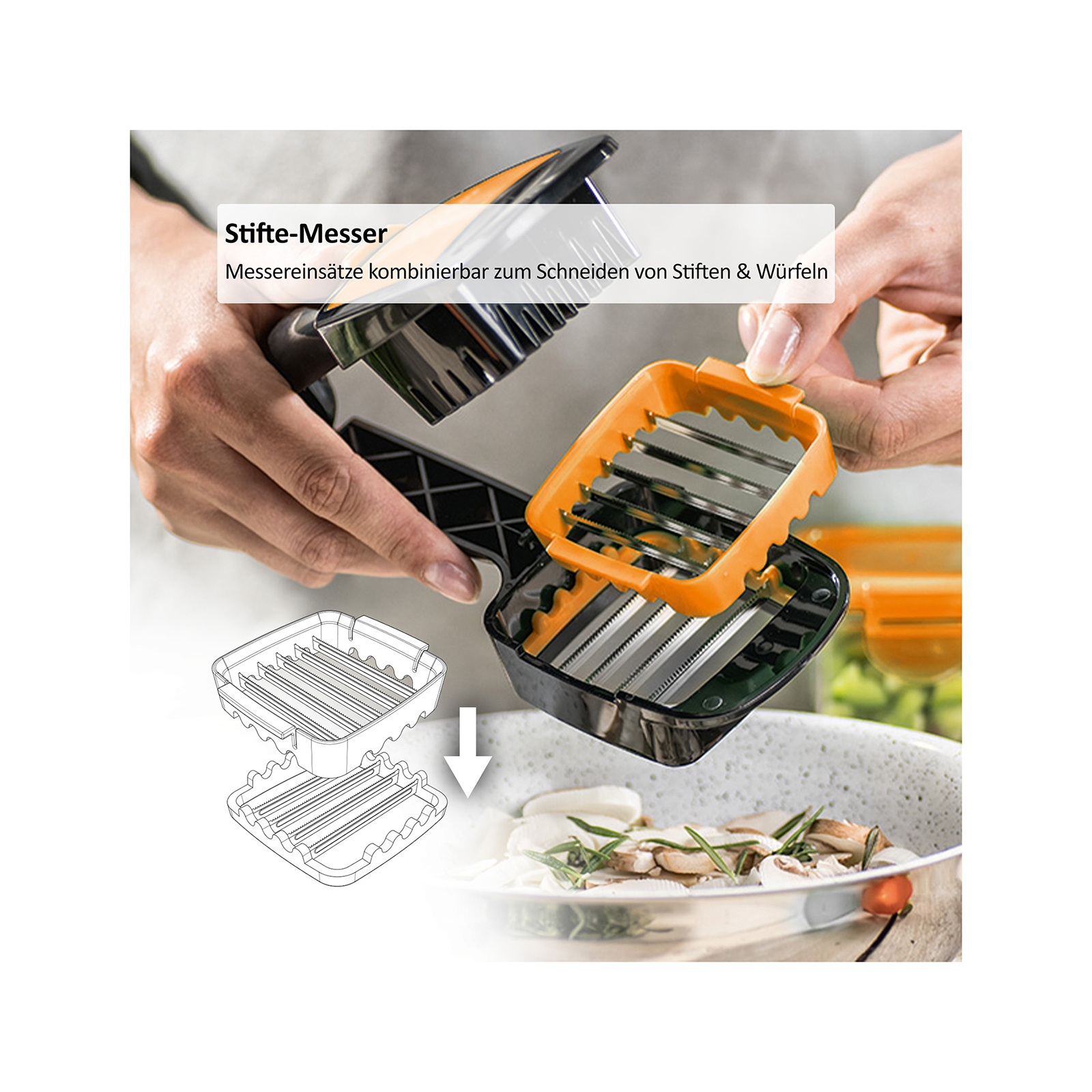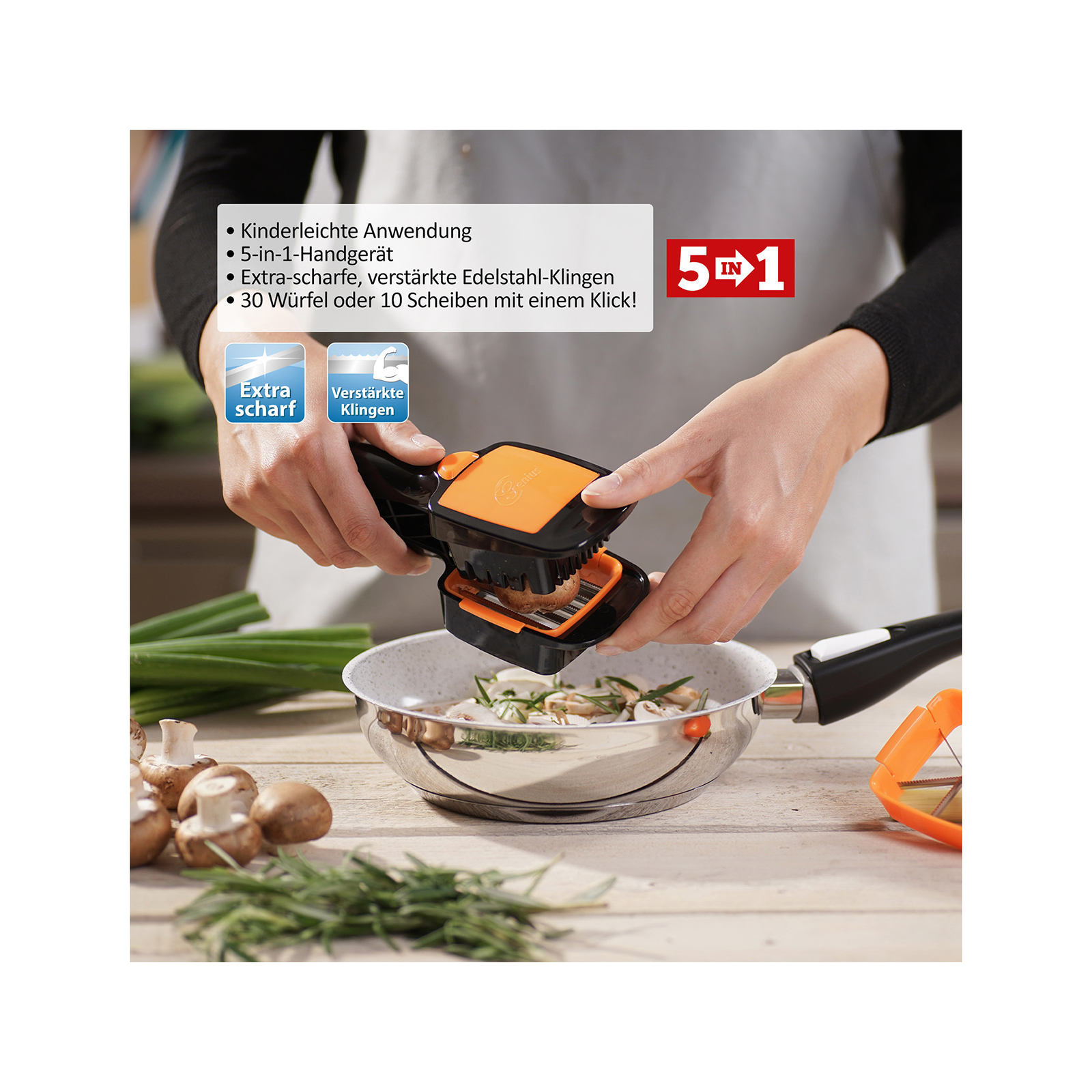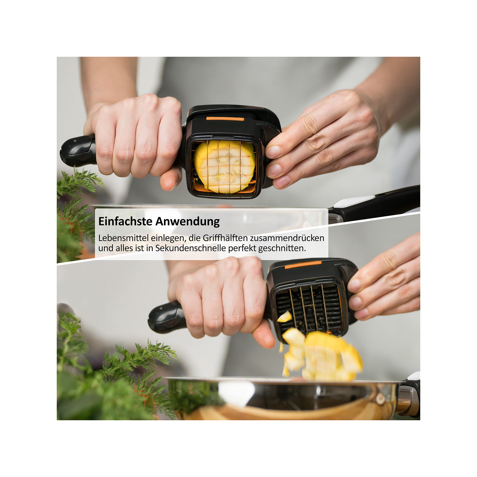 Die verschiedenen Messereinsätze können miteinander kombiniert werden – schneiden Sie dicke Scheiben, dünne Scheiben, Würfel, Stifte und Sechstel! Dazu einfach das Schneidgut einlegen, zudrücken und alles ist in Sekundenschnelle perfekt geschnitten. Egal ob weiche oder harte Lebensmittel wie z.B. Zucchini, Tomate, Pilze, Eier, Zitronen und vieles mehr! Die extra-scharfen Edelstahl-Klingen sind verstärkt und sorgen für schnelle, gleichmäßige Ergebnisse – jedes Mal. Mit dem Nicer Dicer Quick können Sie direkt in die Pfanne, Schüssel oder den Topf schneiden: Für Schnelligkeit und Flexibilität ohne großen Aufwand und Schmutz in der Küche.