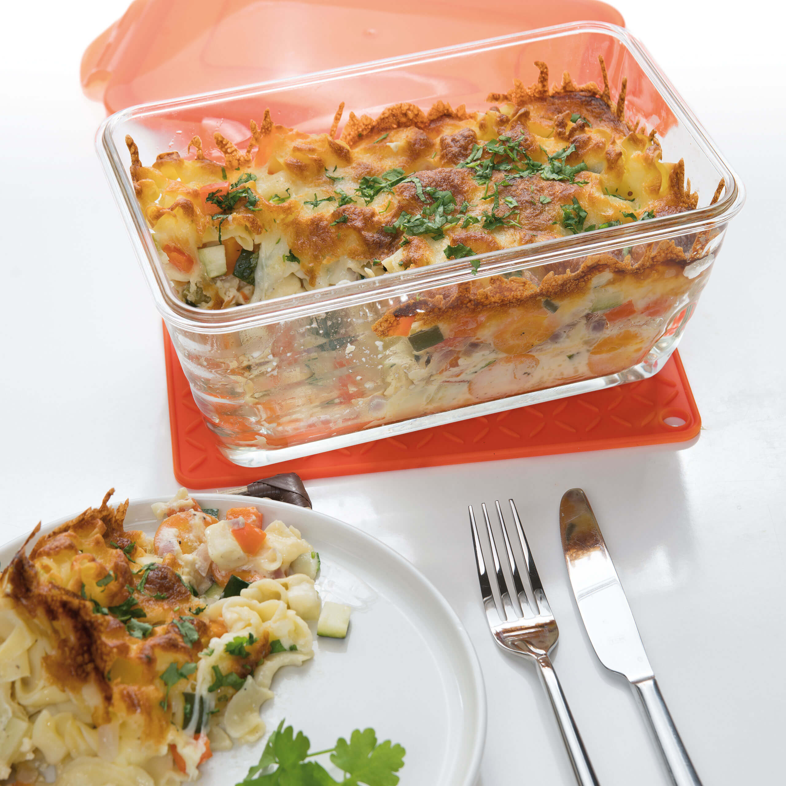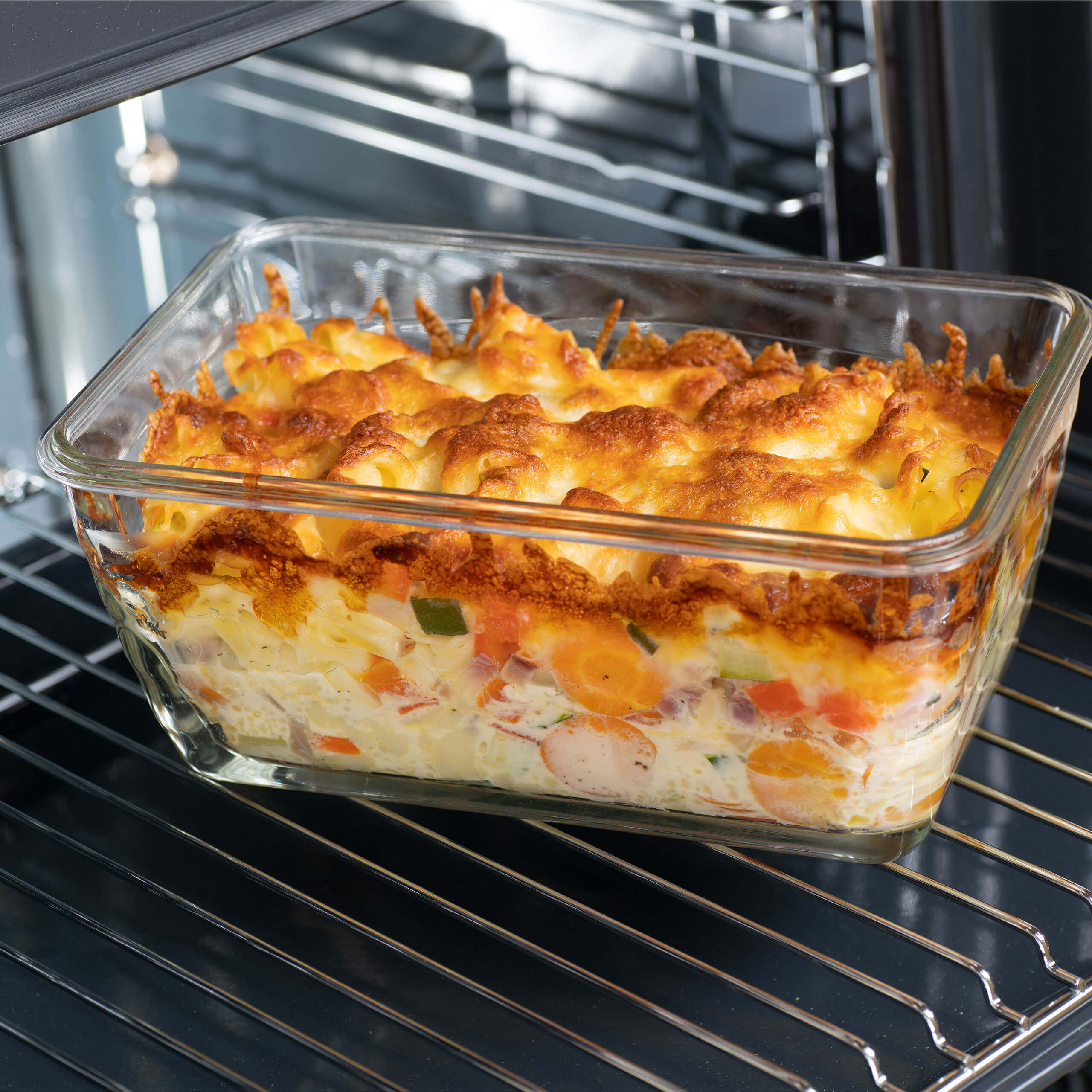 Ab jetzt können alle Arbeitsschritte in nur einer Schüssel erledigt werden – vorbereiten, backen und servieren! Die Glasschüssel ist backofengeeignet bis 250°C und gefriergeeignet bis -18°C. Perfekt für Aufläufe, Gratins und Ofengerichte aller Art! Verschiedene Gerichte für die ganze Familie können unkompliziert zubereitet werden – bis zu 4 Gerichte passen dank der kompakten Größe der Glasschüsseln gleichzeitig auf ein einziges Backblech!