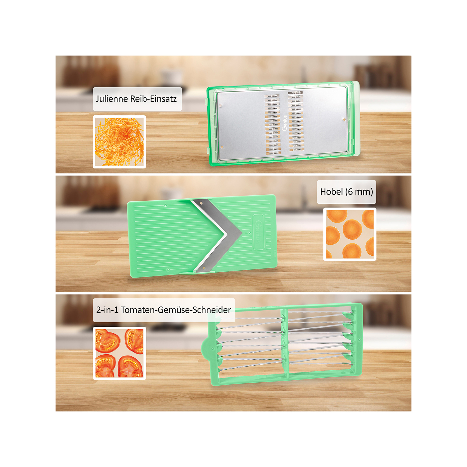 • 3 austauschbare Einsätze in einem Set: Scheiben in 3 verschiedenen Stärken, Streifen, Gehobeltes und Julienne!