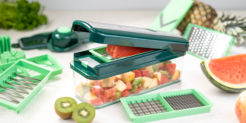 FD-NDK-6-b-800x400Die Messer vom Nicer Dicer sind ultra-scharf, robust und nachhaltig. Neben absoluter Schärfe sorgt der Nicer Dicer für Abwechslung und Vielfältigkeit in der Küche. Der Nicer Dicer bietet je nach Set unzählige Schneidvarianten. Es gibt kleine, mittelgroße und große Würfel und Stifte, dünne und dicke Scheiben, Streifen, Viertel, Achtel, Sechstel, Gehobeltes in nahezu jeder Dicke, Geriebenes in nahezu jeder Stärke, Julienne-Streifen, Spiralen und Juliettis.
