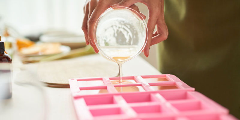 • Gib das Olivenöl und 10 bis 15 Tropfen ihres ausgewählten ätherischen Öls dazu, um ihrer Seife einen angenehmen Duft zu verleihen.