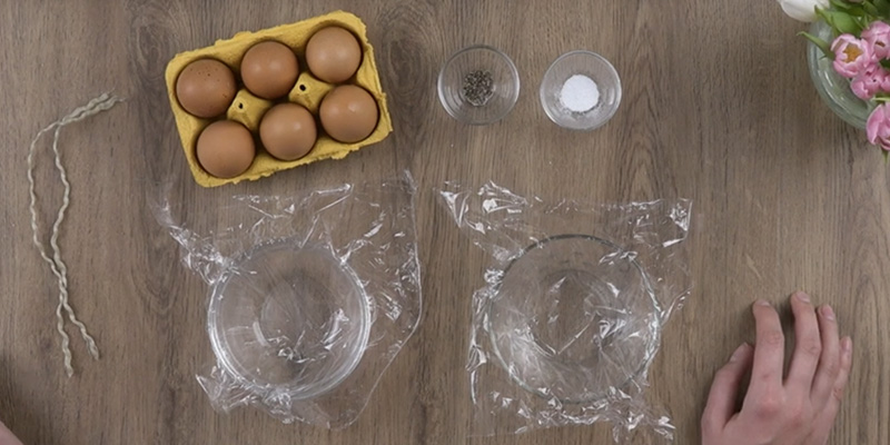 Pochieren ist besonders beliebt zur Zubereitung von Eiern. Beim Pochieren von Eiern gibt es verschiedene Tipps und Tricks. Dies ist unser Tipp zum einfachen Pochieren (von 2 Eiern): Die 2 Stücke Frischhaltefolie je in eine kleine Schale legen und die Innenseite mit etwas Öl bepinseln. Die Eier je auf die vorbereiteten Frischhaltefolie-Stücke in die Schale schlagen und mit Salz und Pfeffer würzen. Die Enden der Frischhaltefolie zusammenbinden, sodass das Ei nicht herauslaufen kann.