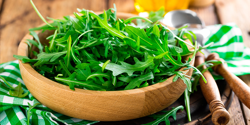 Rucola: Rucola ist ein Salat, der sehr würzig und leicht scharf schmeckt. Dies hat er den Senfölen zu verdanken, die sich in den Blättern befinden. Zudem enthält Rucola Folsäure und Vitamin B, welche unter anderem Herz-Kreislauf-Erkrankungen und Demenz vorbeugen können. Um den Salat im Kühlschrank frisch zu halten, decken Sie ihn einfach mit einem feuchten Tuch ab.