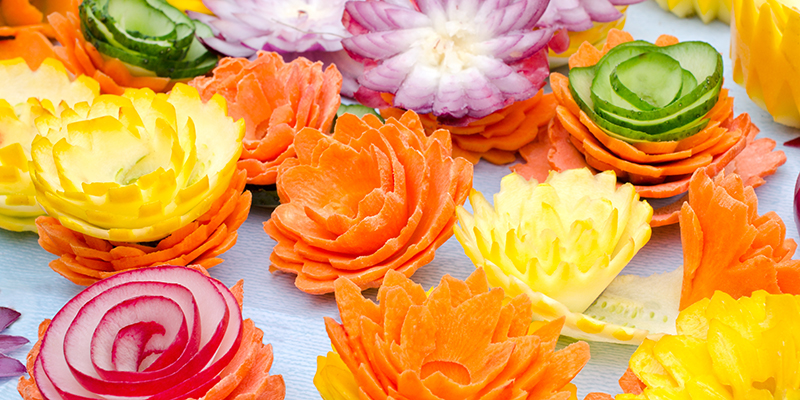 FD-ABC-70-a-800x400Dekorative und gleichmäßige Würfel, abgerundete Formen oder Gemüse in Blütenform zusammenstecken zum Garnieren von Speisen – mit Tournieren bekommen Sie das schnell und präzise hin. Lassen Sie einfach wahre kulinarische Kunstwerke entstehen. Ihr Essen besteht z.B. aus einem Meer aus Blüten aus Obst oder Gemüse und lädt zum Essen und Genießen ein. Zum Tournieren eignen sich besonders Obst und Gemüsesorten wie Kartoffeln, Karotten, Zucchini, Kohlrabi, Gurken, Orangen und Zitronen. Tournieren ist eine wahre Kunst und erfordert ein wenig Übung und gutes Zubehör. Welche Fertigkeiten Sie benötigen und was an Equipment gebraucht wird erfahren Sie hier.