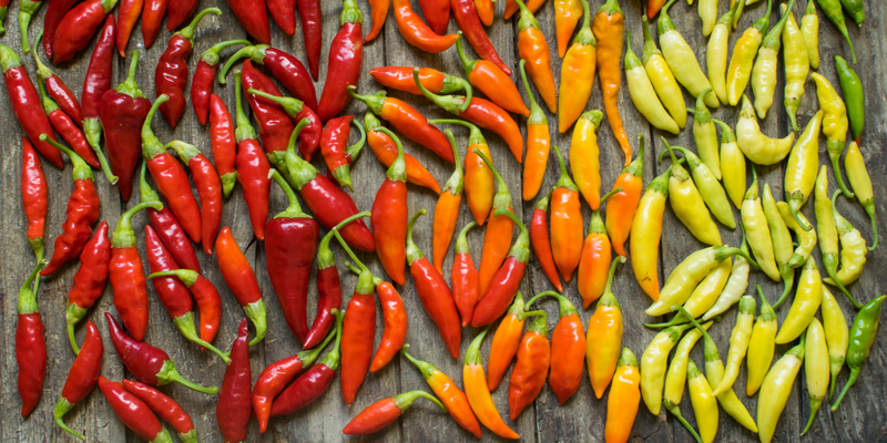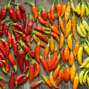 Die scharfe Schote: Chili. Über den Seeweg kam sie nach Europa auf unseren Speiseplan. Egal ob wir sie unter dem Namen Chilischote, Peperoni, Pepper oder einfach nur Chili kennen, sie bringt richtige Schärfe in unser Essen. Chili gibt es in unzähligen Formen, Farben und Schärfegraden und die können es in sich haben! Hier gilt, je kleiner umso feuriger. Am schärfsten sind die Kerne im Inneren der Chili. Der Schärfegrad der Chili wird in Scoville gemessen – die schärfste Chilisauce der Welt hat 9 Millionen Scoville. Weltweit gibt es viele hunderte verschiedene Sorten! Ob getrocknet, eingefroren, eingelegt oder frisch, ihre Schärfe und gleichzeitige fruchtige Note, passt zu unzähligen Gerichten. Sogar zu süßen Gerichten: Chili z.B. in Schokolade oder im Mango-Sorbet verleiht das gewisse Extra!