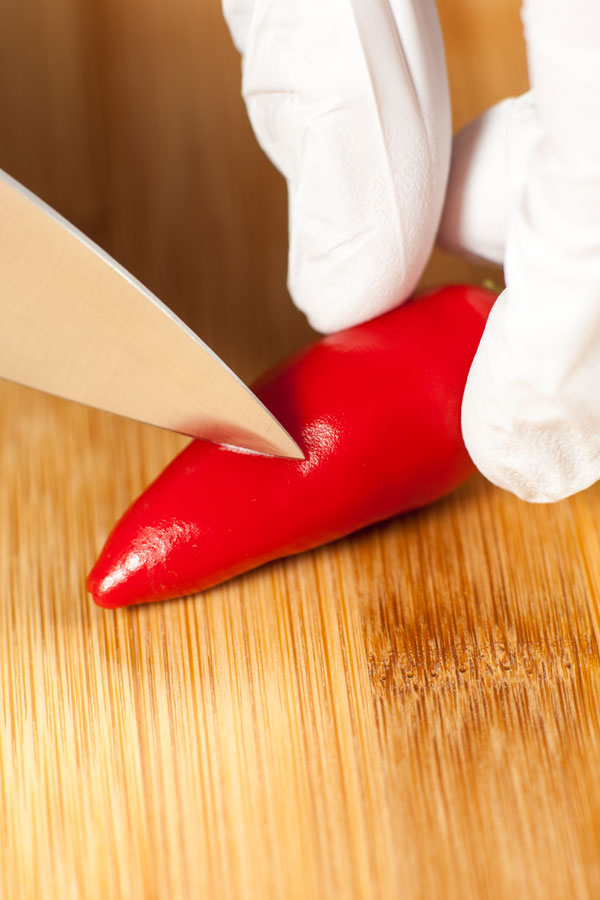 Chilis sind nicht nur lecker, sie kurbeln auch unseren Stoffwechsel an. Leider kann es sehr unangenehm werden, wenn man sie mit den bloßen Händen schneidet und/oder entkernt. Die Schärfe geht in die Haut und alles was man nach dem Schneiden anfasst, fängt an zu brennen. Fatal wenn man sich am Auge oder im Gesicht reibt. Unser Tipp: Beim Schneiden von Chili immer Einweg- Handschuhe tragen. So vermeiden Sie unangenehme Reizungen der Haut und Schleimhäute.