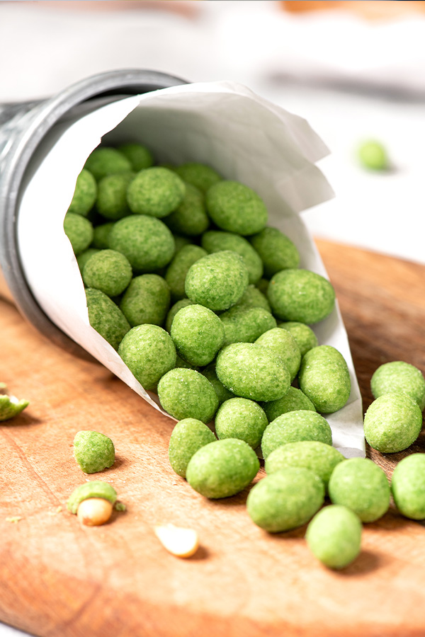 Wer Erdnüsse und Schärfe mag, der wird diese Variante lieben. Erdnüsse mit Wasabimantel sind so richtig lecker. Es ist ein Snack, der es in sich hat. Nun ja, in diesem Fall eher um sich hat. Dazu benötigt man ca. 300 g ungesalzene und geröstete Erdnüsse, leicht steifgeschlagenes Eiweiß von 2 Eiern, 5 TL Wasabipulver (bekommt man im Internet oder Asialaden) 3 EL grobes Meersalz, 2 EL Wasabi- Paste (bekommt man dort wo es Wasabipulver gibt) und 2 EL Speisestärke. Den Backofen auf ca. 150° C Umluft vorheizen und ein Blech mit Backpapier auslegen. Nun die Erdnüsse mit dem Salz mischen und dann auf ein Sieb geben, um das überschüssige Salz zu entfernen. Jetzt das Wasabipulver und die Stärke nach und nach unter das Eiweiß heben. Ist alles verrührt, gibt man die Wasabi Paste dazu und vermischt alles gut miteinander. Dann kommen die Erdnüsse hinein und hebt sie unter die Masse, so das alle Nüsse gut bedeckt sind. Danach gibt man sie auch das Backblech und für ca. 10- 15 Minuten in den Backofen. Danach schaltet man den Backofen aus und lässt sie weiter darin trocknen.  Das dauert ca. 40 Minuten. Jetzt sind sie zum Knabbern fertig.
