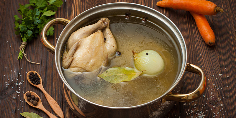 Brühen, wie auch die Hühnerbrühe, bilden die Grundlage für Suppen, Saucen und andere Gerichte. Sie sind so etwas wie die Essenz von Gemüse- ,Fleisch-, Fisch- oder Geflügelsorten. Durch langes und langsames vor sich her köcheln werden die Inhalts- und Geschmacksstoffe der Lebensmittel an das Wasser in dem sie Kochen abgegeben und dadurch besonders intensiv im Geschmack. Daher verleihen sie Gerichten jeglicher Art eine besonders würzige Note. Bei der Hühnerbrühe kocht man, wie sollte es auch anderes sein Huhn und/ oder Hühnerklein zusammen mit grob geschnittenem Suppengemüse und Gewürzen für mindestens 3 Stunden langsam aus. Nach dieser Zeit filtert man die Suppe und lässt sie abkühlen. Beim Erkalten bildet sich eine Fettschicht obenauf und diese kann einfach entfernt werden. Zurück bleibt eine kräftig schmeckende Hühnerbrühe. Diese kann ganz einfach selbst zuhause gekocht werden. Aber auch in jedem Supermarkt findet man sie als Instant, als Würfel oder flüssig im Glas im Regal und kann sie bequem kaufen. Man verwendet Brühen aber nicht nur als Grundlage für Suppen und Saucen. Auch kann man Reis oder Nudeln in ihr kochen, um diese würziger zu machen. Oder man kann Eintöpfe wie auch Pfannengerichte mit ihr verfeinern.