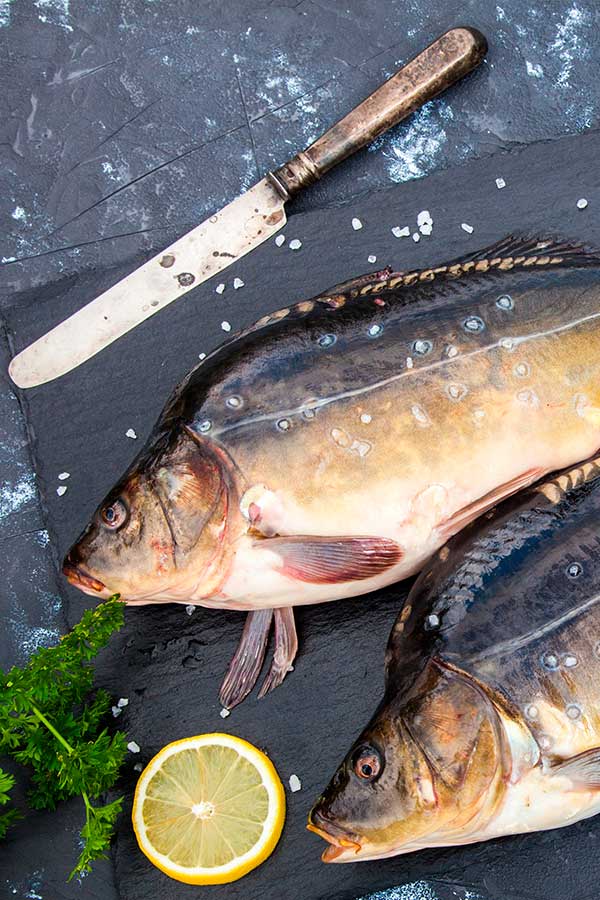 Der Karpfen kam ursprünglich von Asien aus schon durch die alten Römer zu uns nach Europa. Hier wurde er besonders während der Fastenzeit sehr geschätzt. Heute wird er in großen Umfang gezüchtet und man bekommt ihn eigentlich nur noch von Zuchtfarmen. Wildfang ist verboten, da er zu den gefährdeten Fischarten gehört. In freier Wildnis kann ein Karpfen bis zu 50 Jahre alt werden. In der Zucht werden die Fische im Alter von 2 bis 3 Jahren und ca. 1 bis 2 Kilogramm Gewicht abgefischt. Das Abfischen ist ein Auslassen des Wassers aus dem Becken, nachdem die Fische in den Tagen davor kein Futter mehr bekommen haben und auch häufig in ein Becken mit klaren Frischwasser gesetzt wurden. Ist das Wasser aus dem Becken bzw. Teich raus, kann man die Fische anschließend einsammeln. Der Karpfen hat ein mageres und sehr leckeres Fleisch, besonders die Fische, die nach dem Abfischen im Handel kommen.