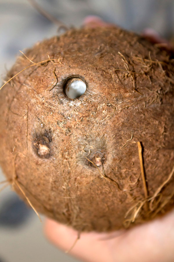 Die Kokosnuss zu knacken ist nicht ganz leicht aber mit ein wenig Übung und dem einen oder anderen Trick geht es recht einfach. Wenn man zwei der drei Augen (Eindrücke auf der Schale) mit z.B. einem Schraubendreher einsticht, so bekommt man Löcher und kann das leckere Kokoswasser in einem Behälter ganz leicht auffangen. Nun nimmt man einen Hammer und kann die Nuss auf einer festen Unterlage vorsichtig aufschlagen. Das Fruchtfleisch lässt sich dann ganz leicht mit einem Messer von der Schale lösen.