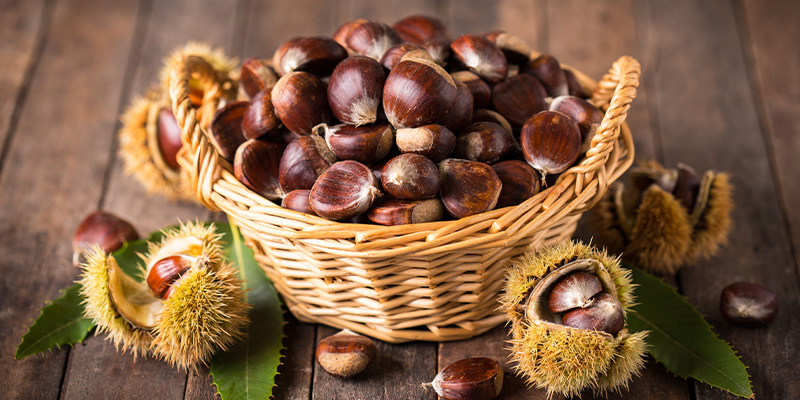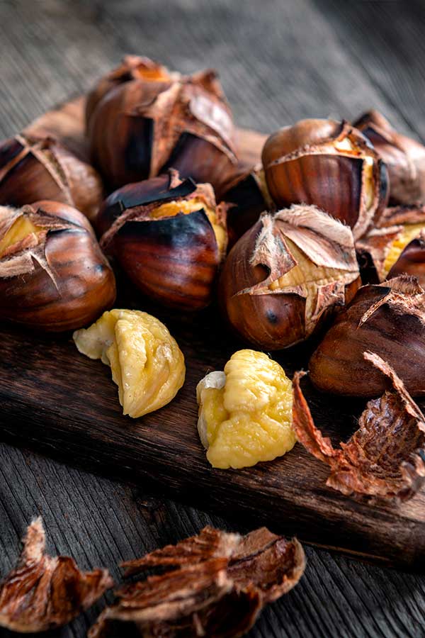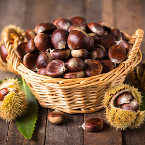 Die Marone wird auch Esskastanie oder einfach Maroni genannt. Sie gehört zu den Nussfrüchten die essbar sind. Sie wachsen an Bäumen, die bis zu 30 Meter hoch werden können. Ihre Form erinnert an Herzen und ihre Schale ist rot-braun mit dunklen Streifen. Doch werden diese Nussfrüchte bei der Zubereitung ähnlich wie Gemüse verwendet. Der Geschmack von rohen Maronen ist mehlig-herb und nicht genießbar. Doch wenn man sie röstet, haben sie einen kräftigen, leicht süßen-sahnigen Geschmack. Dieser Geschmack ist toll geeignet für eine gute aromatische Maronen Suppe oder ein Maronen Püree. Auch zum Füllen von Gans und Truthahn eignen sich Maronen hervorragend. Man kann verschiedene Produkte aus Maronen kaufen. Das Maronen-Mehl z. B. eignet sich für viele Backwaren und ist auch für Menschen mit Glutenunverträglichkeit geeignet. Es gibt auch Maronenflocken und Pulver, die toll zum Kochen und Backen genutzt werden können oder man gibt sie einfach mit in sein Müsli. Doch wenn man sie geröstet oder gekocht genießen möchte, so muss man sie direkt nach dem Zubereiten schälen. Da ihre Schale und die Innenhaut sich nicht immer leicht entfernen lassen, kann man gekochte Maronen kurz mit kaltem Wasser abschrecken. Geröstete Maronen haben meistens eine aufgesprungene Schale, die man dann abknibbeln kann.