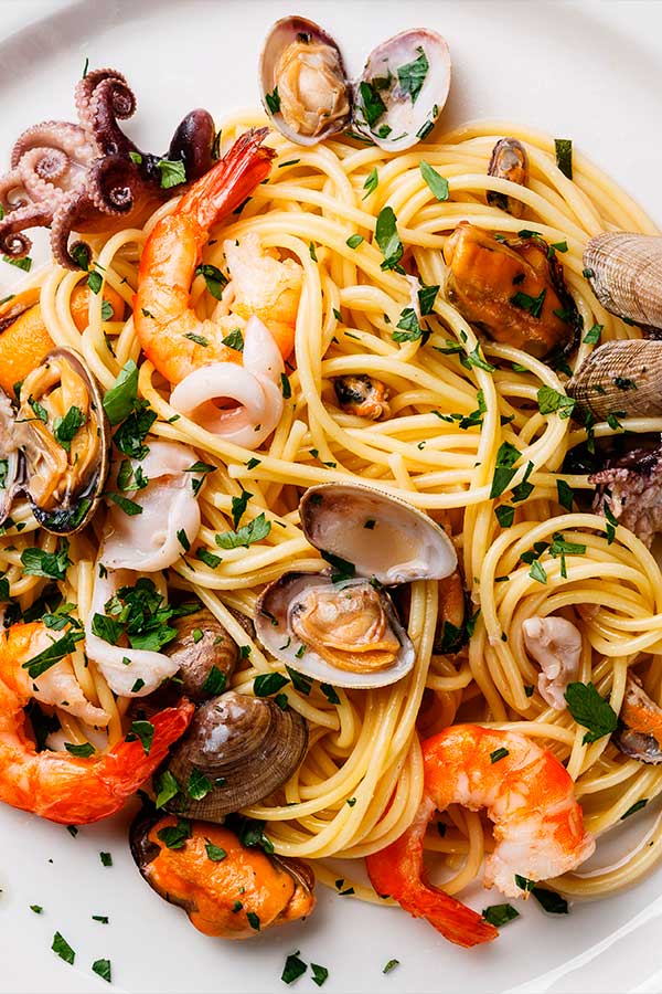 Schnell, leicht und wirklich lecker ist ein Teller Pasta mit Meeresfrüchten. Das ist mediterran und passt toll auf jeden Speiseplan und das nicht nur in den Sommermonaten. Ein tolles Rezept für 2 Personen ist, wenn man ca. 200 g Spaghetti, 250 g gemischte Meeresfrüchte, 150 ml Sahne, 1 klein gewürfelte Zwiebel, 1 Knoblauchzehe gehackt, ½ Bund Petersilie gehackt, etwas Weißwein, Öl, Chiliflocken, Salz und Pfeffer aus der Mühle nimmt. Die Pasta wie vorgeschrieben zubereiten und in dieser Zeit etwas Öl in einer großen Pfanne erhitzen. Wenn das Öl richtig heiß ist, gibt man die Zwiebel und den Knoblauch rein und brät sie an. Dann löscht man die Zwiebel mit Weißwein und Sahne ab. Nun gibt man die Meeresfrüchte dazu und lässt alles ein wenig köcheln. Nach ca. 5 bis 6 Minuten schmeckt man diese Sauce mit den Gewürzen und der Petersilie ab. Jetzt nur noch die Pasta abschütten und zu den Meeresfrüchten geben. Alles gut umrühren und auf Teller anrichten. Fertig.