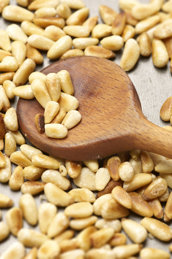Die Pinienkerne sind die Samen von einigen Kieferarten. Von den rund 80 Kiefernarten weltweit reifen in nur etwa 12 Arten essbare Samen heran. Die elfenbeinfarbenen Pinienkerne stecken in den Zapfen der Kiefer. Diese Samen bekommt man, in dem man die Zapfen vom Baum abstreift und in die Sonne zum Trocknen legt. Beim Trocknen öffnen sich die Zapfen und die Samen können herausgenommen werden. Dann löst man sie noch aus ihrer Schale. Ihr Geschmack ist süßlich, mild-harzig bis zart-nussig und erinnert ein wenig an Mandeln. Sie passen zu vielen Fleisch-, Geflügel- und Gemüsegerichte und sind in vielen Pestos ein wichtiger Bestandteil. Pinienkerne eignen sich zum Bestreuen von Salaten aber auch zum Backen und für Reisgerichte sind sie gut geeignet.