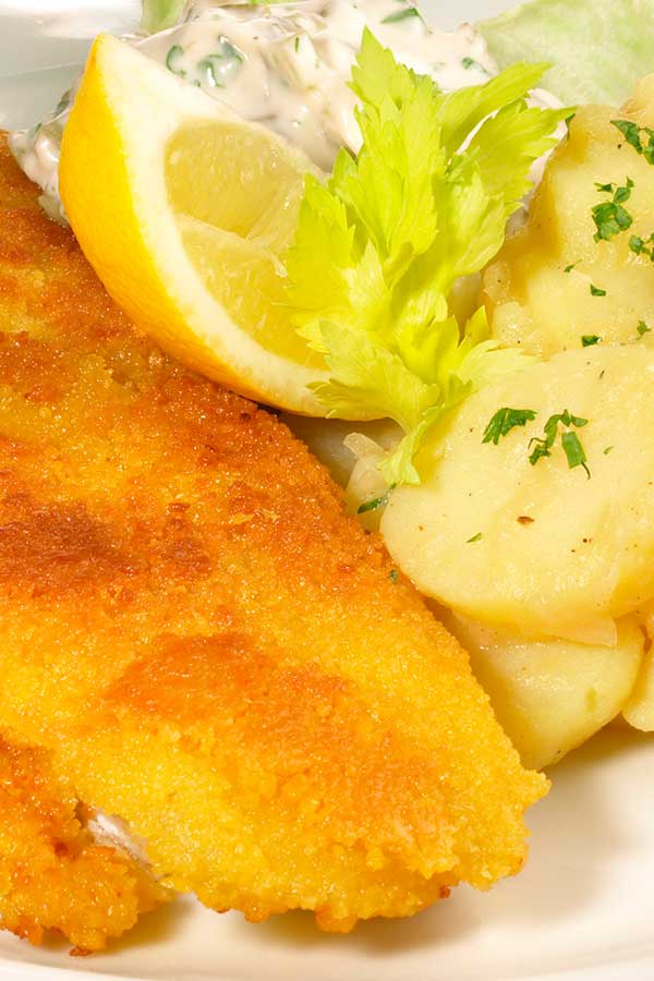 Richtig lecker ist paniertes Seelachsfilet mit Salzkartoffeln und Salat nach Wahl. Dazu pro Portion 1 küchenfertiges Seelachsfilet nehmen. Weiter braucht man etwas Zitronensaft und Paniermehl, 1 Ei aufgeschlagen, 2- 3 EL Butter, Salz und Pfeffer zum Würzen. Das Filet mit dem Zitronensaft beträufeln und mit Salz und Pfeffer würzen. Dann im Ei wenden und im Paniermehl wälzen. Die Butter in einer Pfanne erhitzen und das panierte Filet von jeder Seite bei starker Hitze kurz anbraten. Dann die Hitze reduzieren und einen Deckel auf die Pfanne geben. So lässt man den Fisch nun noch weiter 5 Minuten garen. Danach zusammen mit dem Salat und den Kartoffeln anrichten.