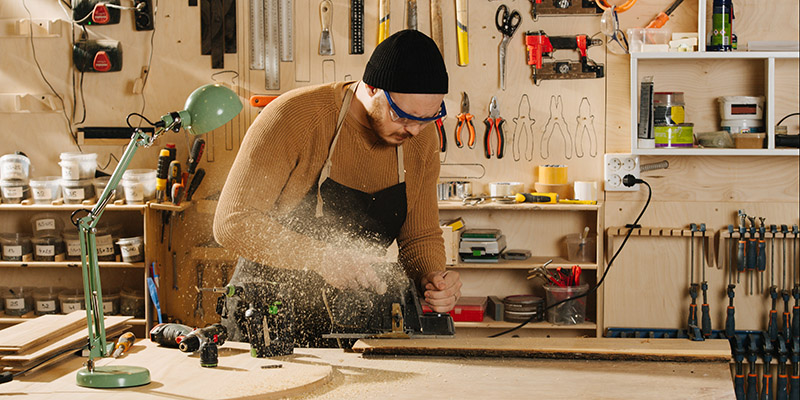 • Großes Werkzeug und Möbel: Stellen Sie große Werkzeuge und Geräte wie zum Beispiel eine Kreissäge, eine Hobelbank oder Generatoren und Kompressoren an einen Platz, an dem sie nicht im Weg stehen und problemlos einsatzbereit gemacht werden können. Die Werkbank sollte an einer Wand stehen und ausreichend Bewegungsfreiheit bieten. Sollte es die Größe Ihrer Werkstatt zulassen, können Sie die Werkbank auch in der Mitte des Raumes aufstellen, damit Sie sich rundherum bewegen können. Schränke können auch an der Wand oder in Ecken Platz finden, die Ihnen Stauraum für wenig genutzte Dinge bieten.