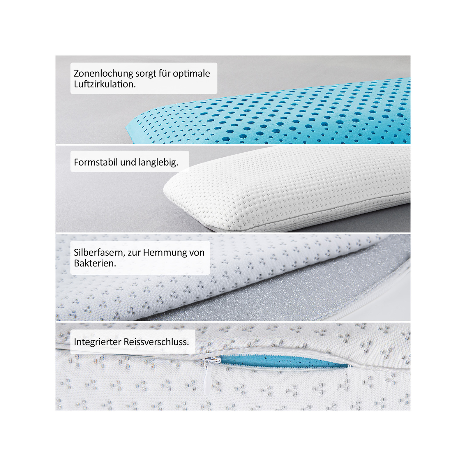 Der weiche und atmungsaktive Kissenbezug ist mit Silber versetzten Fasern durchzogen und kann so Bakterienwachstum hemmen. Darüber hinaus sind Schaum und Kissenbezug OEKO-TEX Standard 100 und Certipur zertifiziert, was bedeutet, dass die verwendeten Materialien frei von Schadstoffen und auch für z.B. Babys und Allergiker geeignet sind.