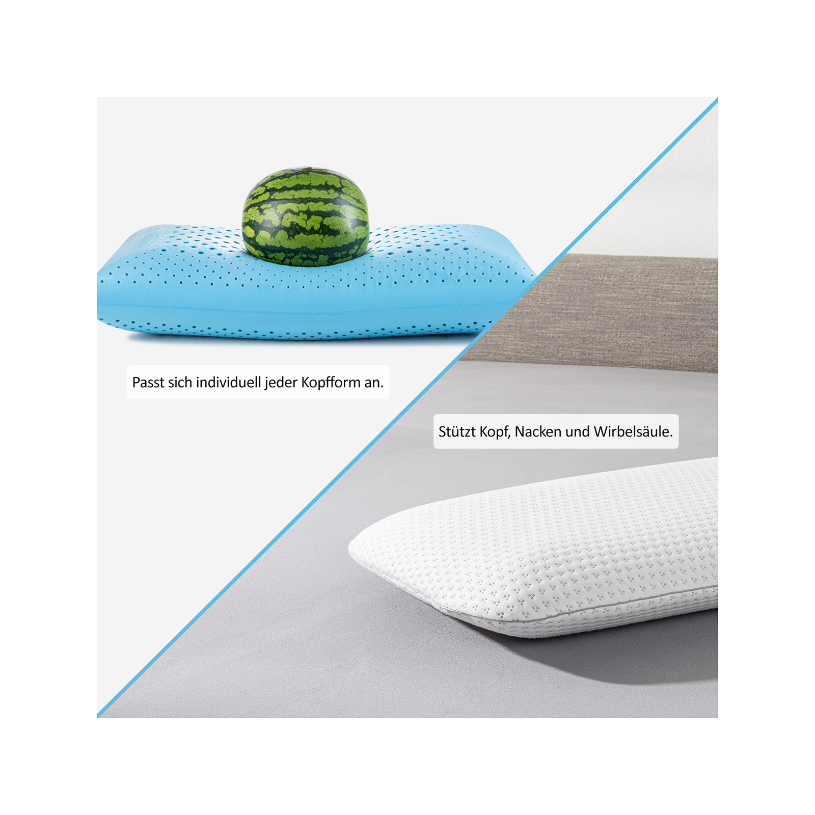 • 2 Härtegrade in einem Kissen durch unterschiedliche Lochung auf beiden Seiten – zwischen 2 Härtegrade wählen, je nach Stimmung
